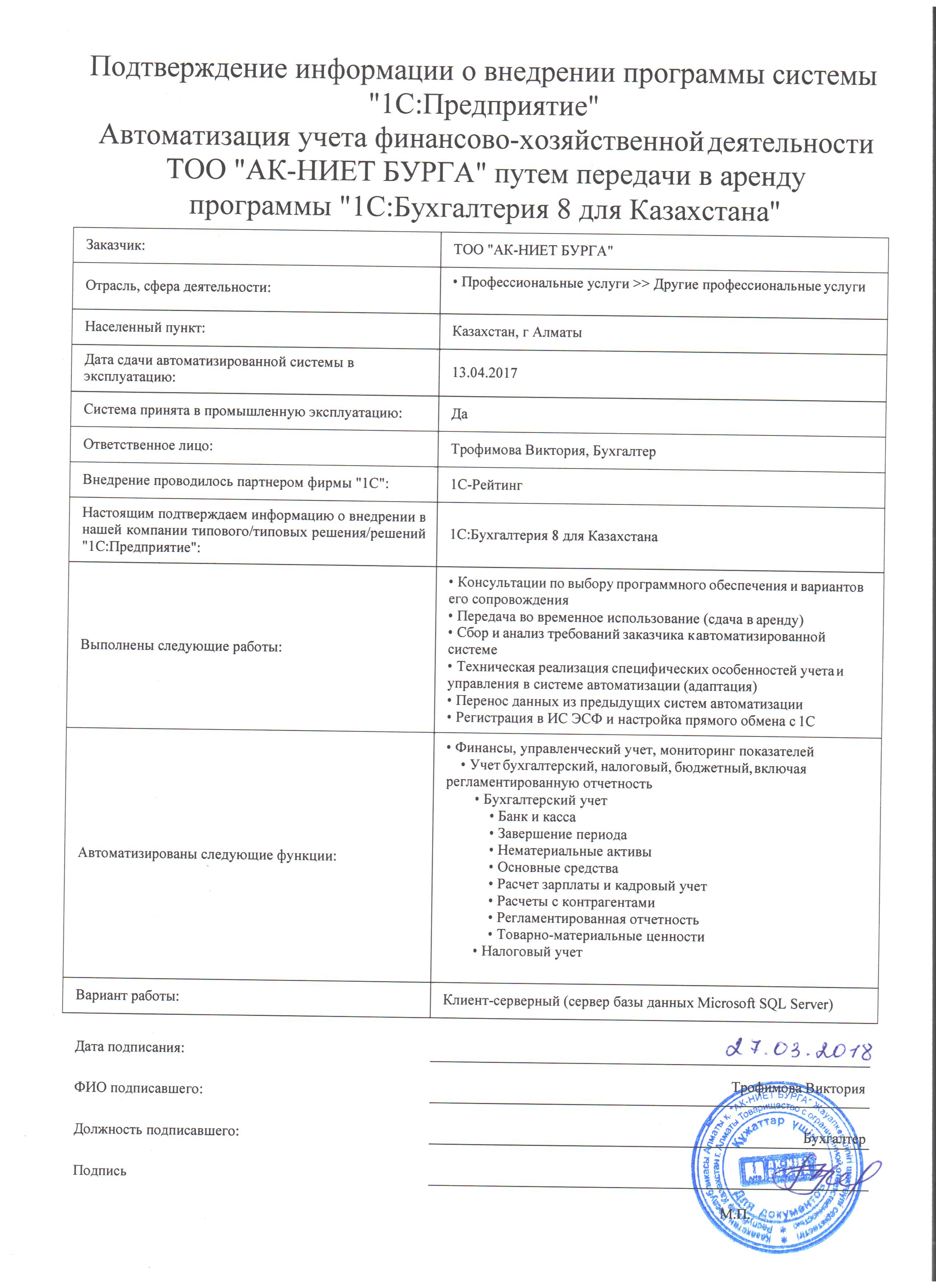 | Арендованное типовое решение: | 1С:Бухгалтерия для Казахстана |