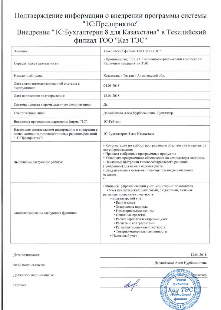 | Внедренное типовое решение: | 1С:Бухгалтерия 8 для Казахстана |