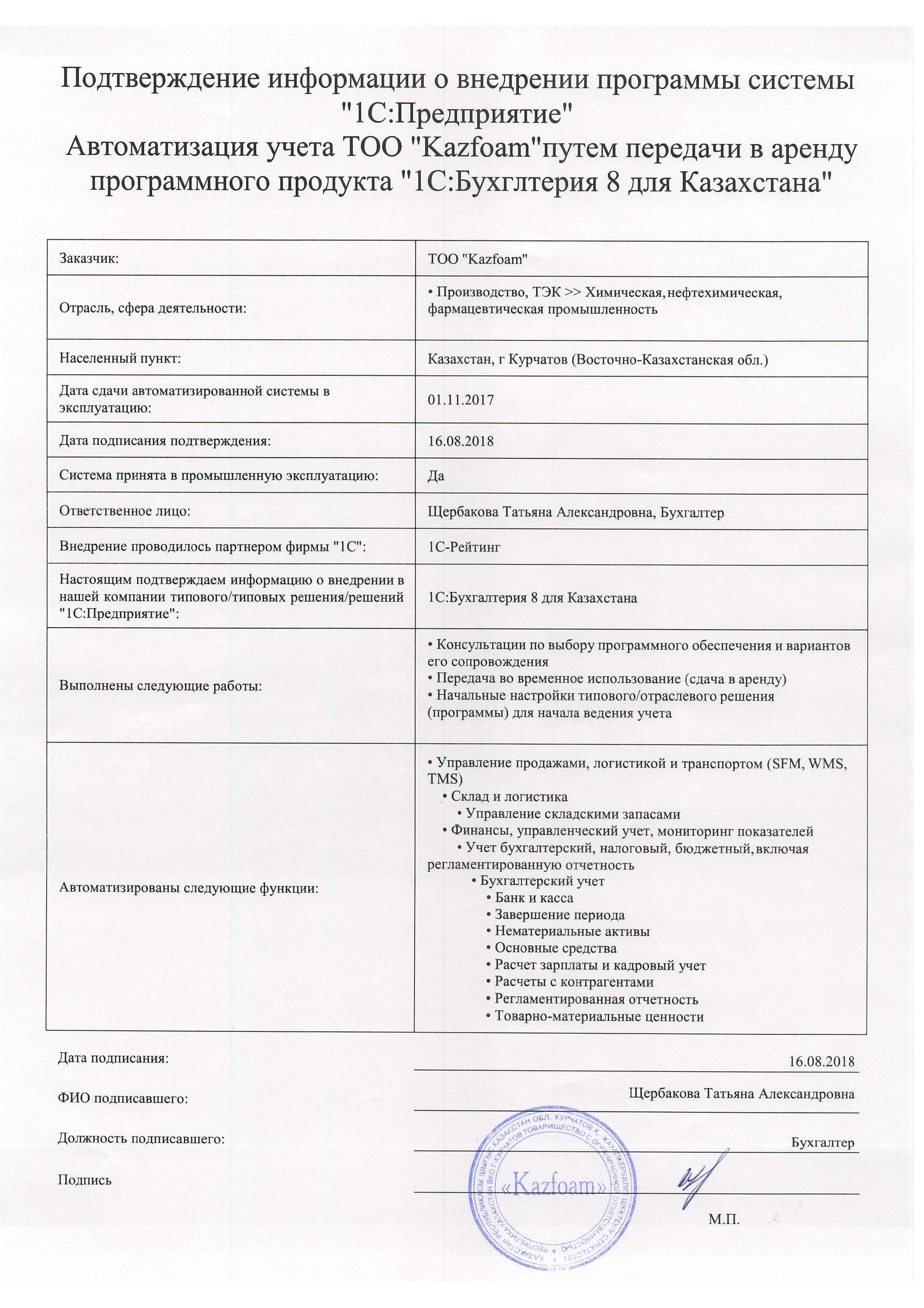 | Арендованное типовое решение: | 1С:Бухгалтерия для Казахстана |