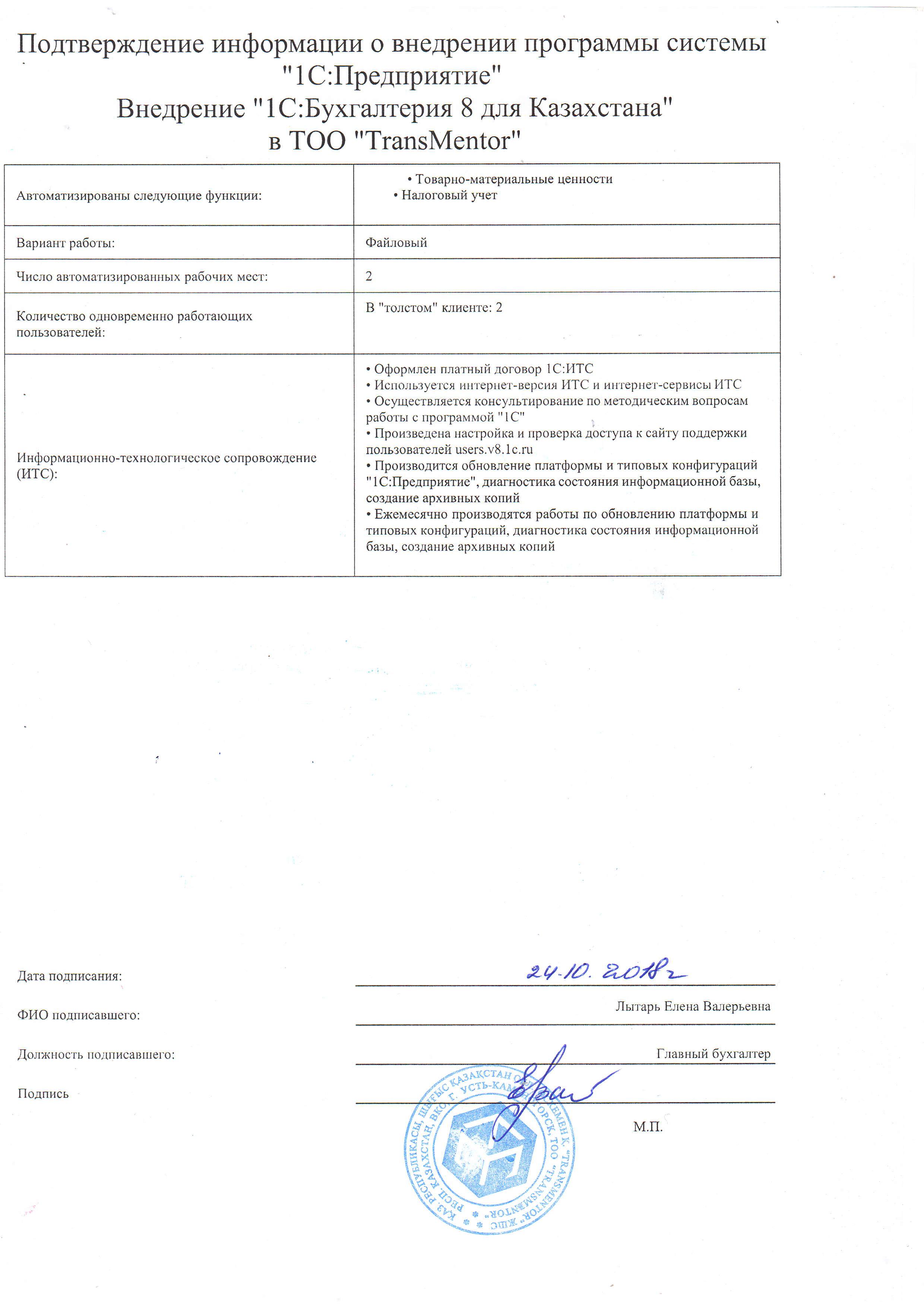 - Оформлен платный договор 1С:ИТС