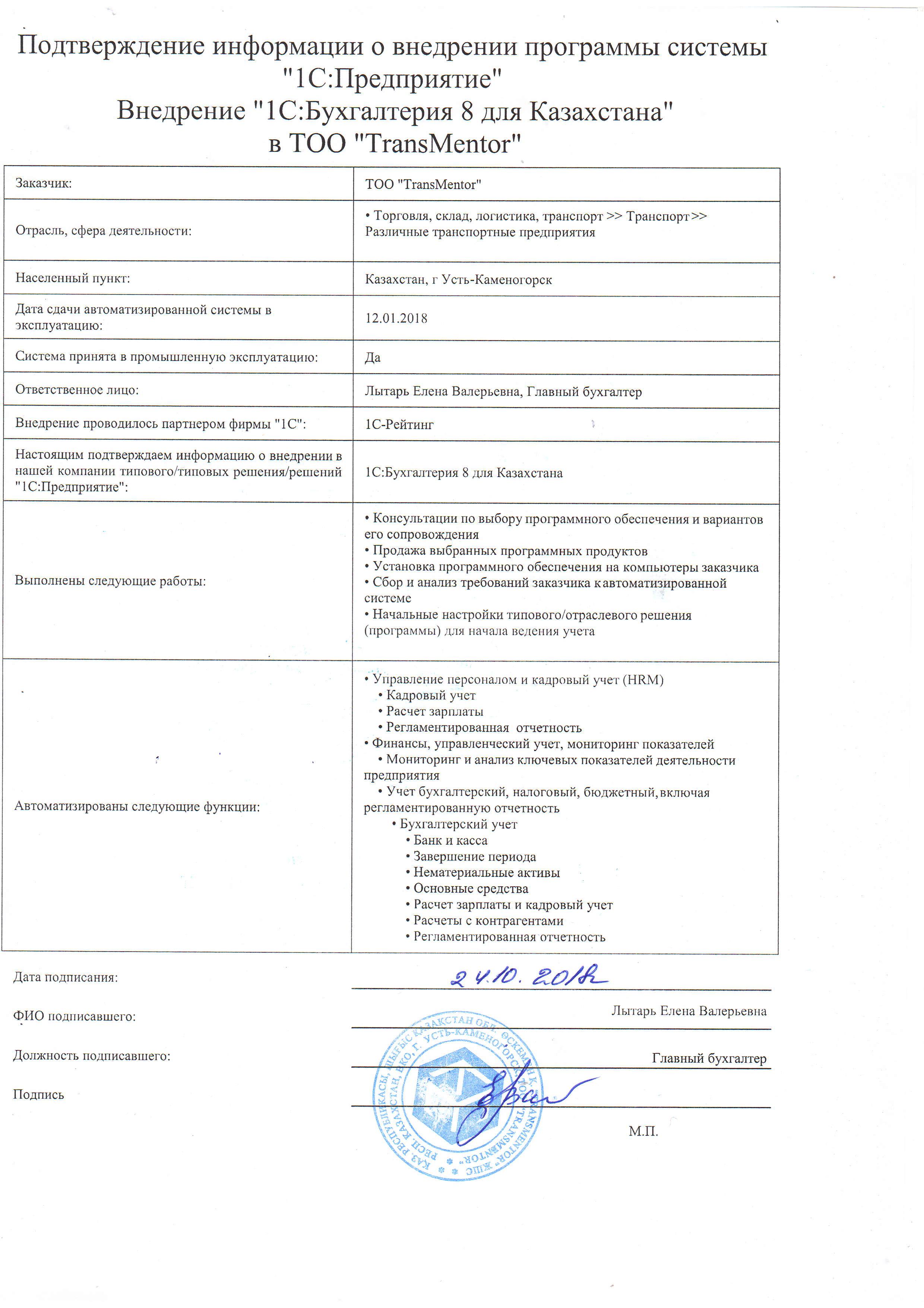 | Внедренное типовое решение: | 1С:Бухгалтерия 8 для Казахстана |