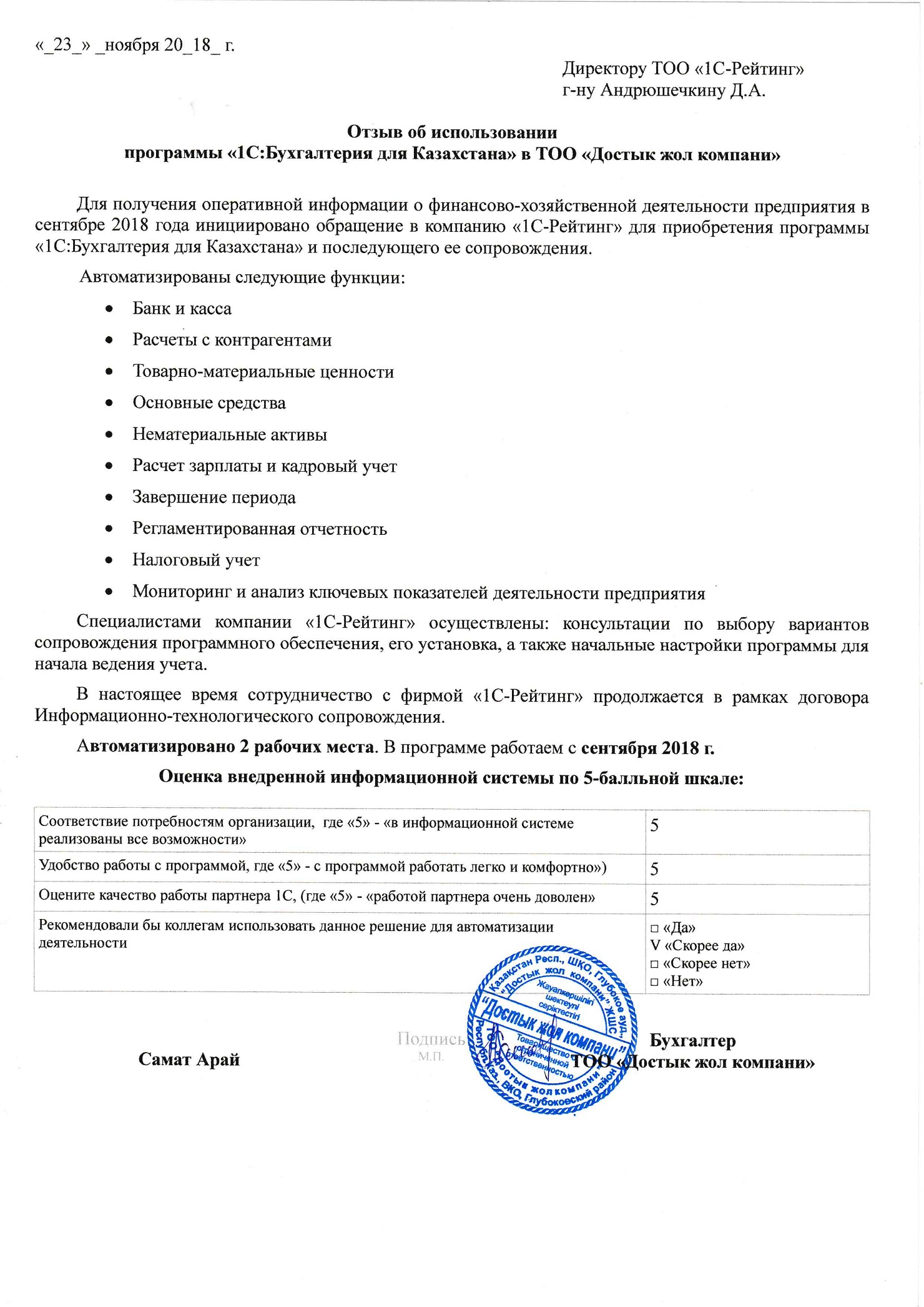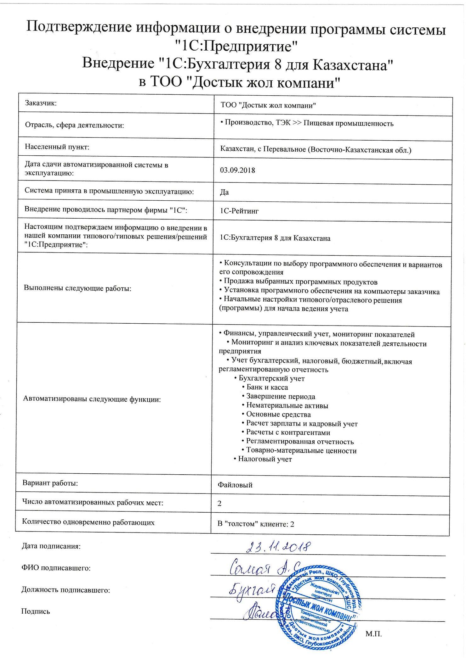 | Внедренное типовое решение: | 1С:Бухгалтерия 8 для Казахстана |