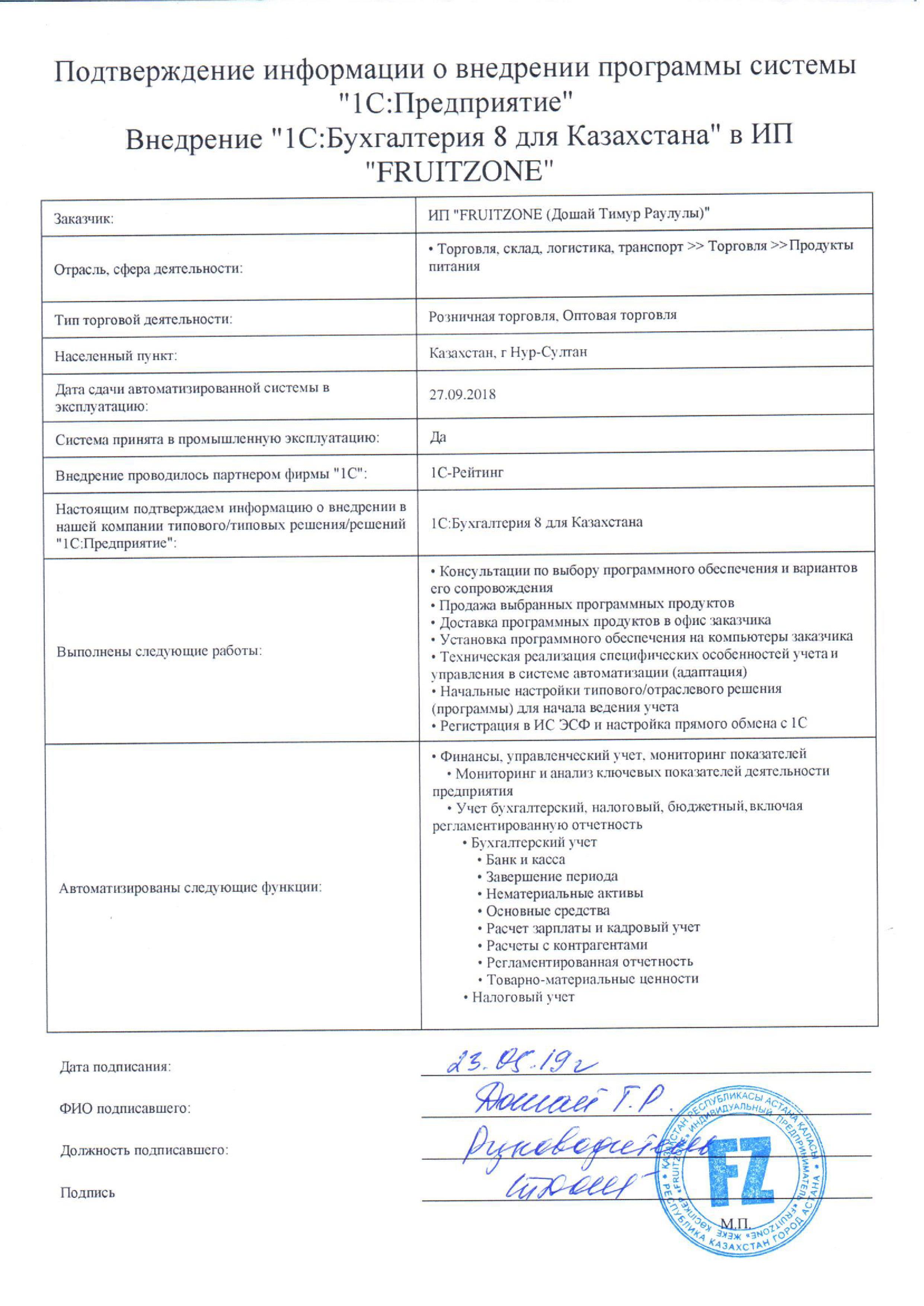 | Внедренное типовое решение: | 1С:Бухгалтерия 8 для Казахстана |