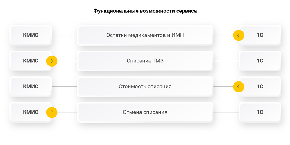 Сервис обеспечивает гарантированную передачу информации о стоимости списанных ЛС и ИМН из 1С в КМИС Damumed. Стоимость считается переданной только после того, как КМИС подтвердит ее получение. В случае отмены (удаления) списания медикаментов, если стоимость еще не была получена системой КМИС – отправка данных отменяется на стороне 1С. В случае корректировки данных списания, происходит повторная отправка.