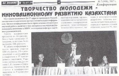 6-27 апреля 2007 г. в Восточно-Казахстанском государственном техническом университете им. Д. Серикбаева состоялась VII Республиканская научно-техническая конференция «Творчество молодых – инновационному развитию Казахстана». Конференция проводилась для студентов, магистрантов, аспирантов и молодых преподавателей и предусматривала работу 16-ти секций.