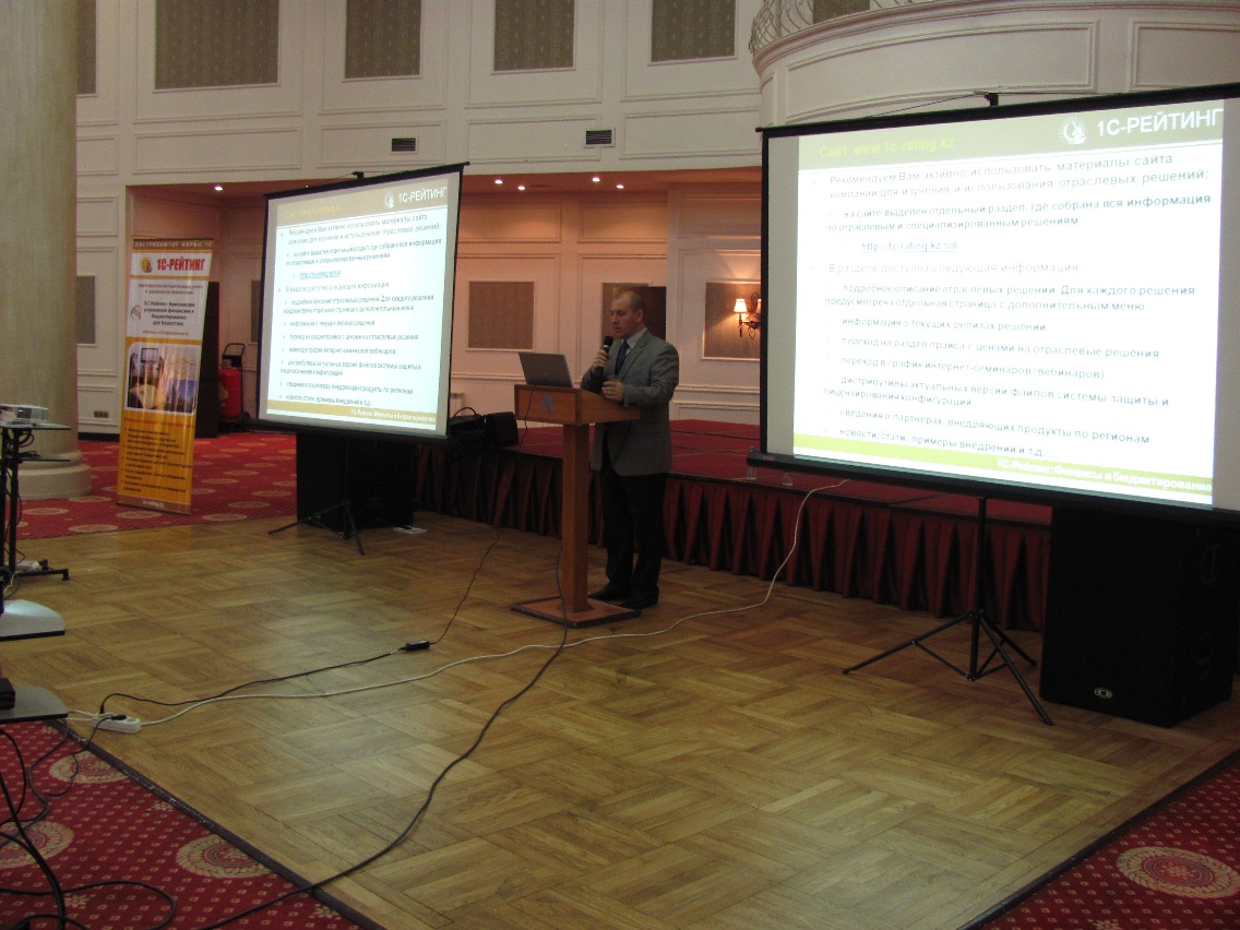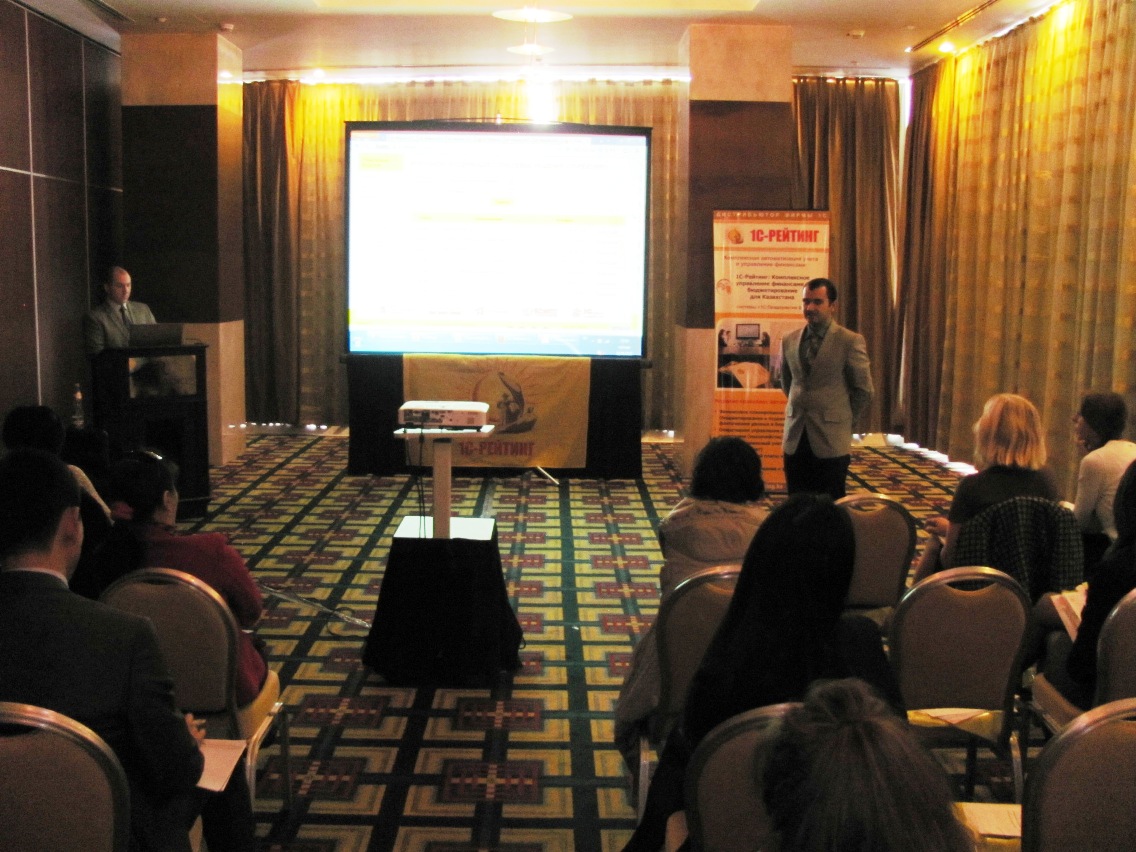 В городах Алматы и Атырау в сентябре 2013 года специалисты компании 1С-Рейтинг провели практическую конференцию «Инструменты управленческого учета и бюджетирования» для предприятий, заинтересованных в оперативном управлении финансовыми потоками и финансовом планировании. Формат мероприятия предполагал обзорную часть и наглядную демонстрацию функциональных возможностей программных продуктов линейки «1С-Рейтинг: Финансы и Бюджетирование». В практическую часть семинара вошли мастер-классы в режиме «1С:Предпяриятие 8» по настройке бюджетов и проведению план-фактного анализа, регистрации договоров с поставщиком и настройке графика платежей, автоматизации казначейских функций.