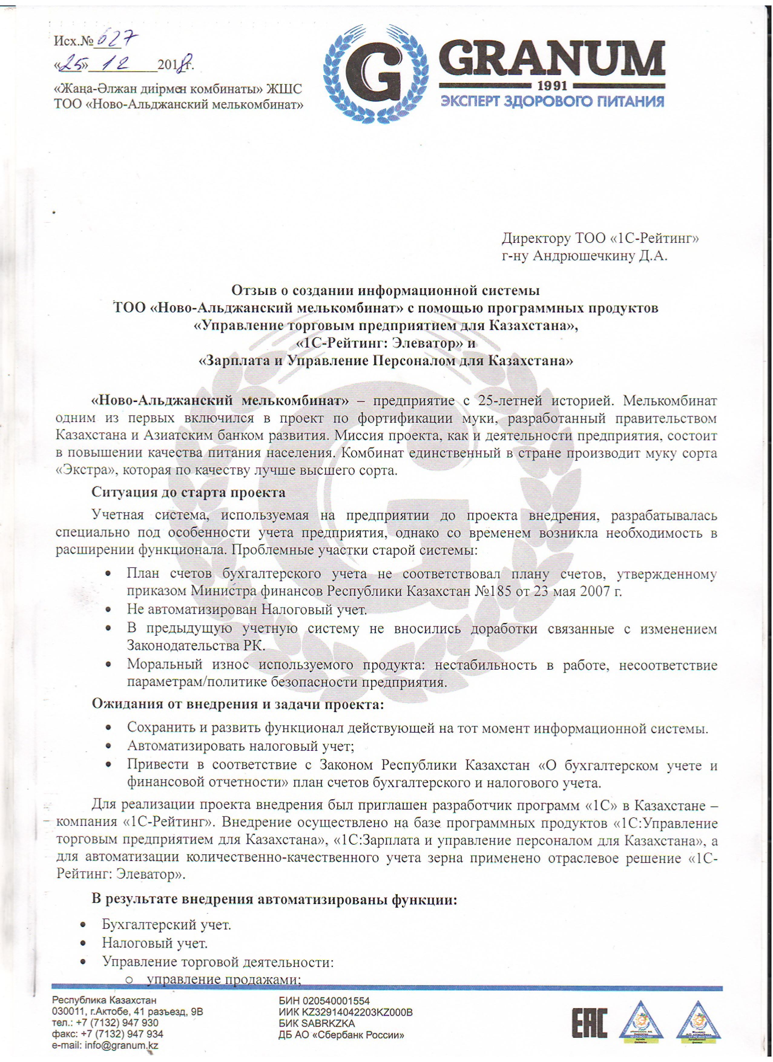 «Внедрение данных решений позволило наладить производственный, бухгалтерский и складской учет на предприятии. Также позволило перейти на требуемый законодательством обмен данных с информационной системой «Электронные счет фактуры». Постоянное обновление «1С:Предприятие» с учётом изменений законодательства РК позволяет оперативно реагировать на данные вопросы.