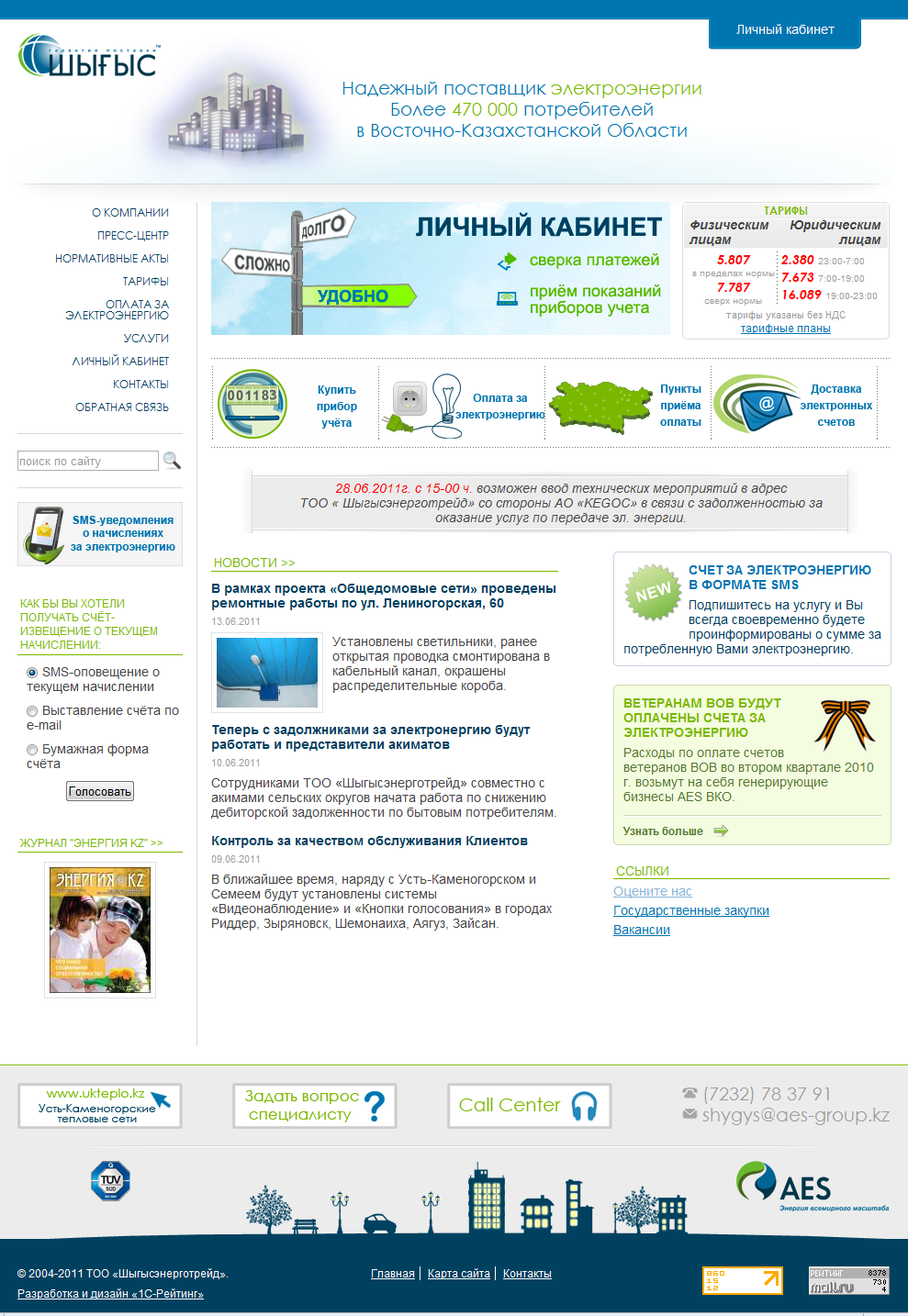 В ходе проекта специалистами отдела веб-разработок «1С-Рейтинг» для сайта «Шыгысэнерготрейд» был создан уникальный дизайн на основе корпоративного стиля компании, помогающий посетителям легко ориентироваться в структуре сайта и быстро переходить к необходимой информации. Зайдя на сайт, любой потребитель электроэнергии может найти информацию о текущих тарифах, способах энергосбережения, услугах и новостях компании, а зарегистрировавшись в личном кабинете – проверить состояние своего лицевого счета, оставить показания приборов учета или сообщение-отзыв о работе энергоснабжающей организации, а также подписаться на услугу e-mail оповещения о начислении за электроэнергию, в демонстрационном режиме сроком на 90 дней.