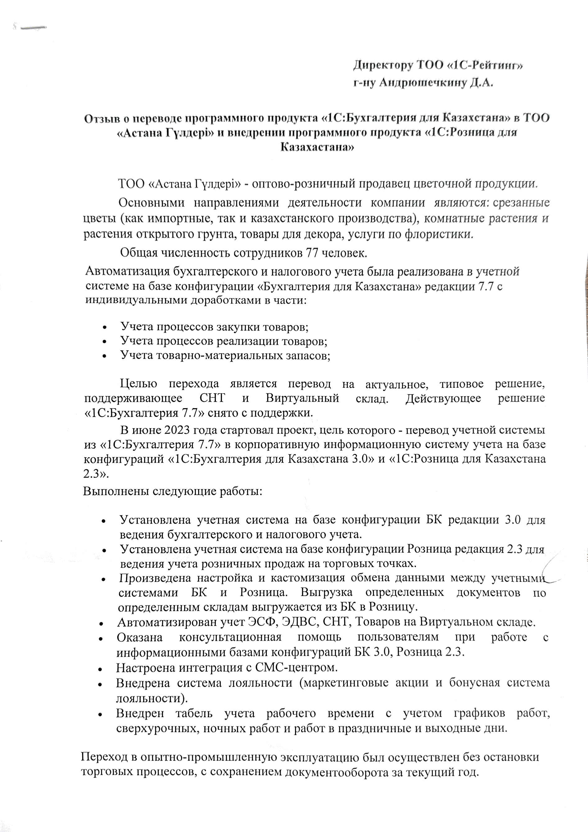 - Переход в опытно-промышленную эксплуатацию был осуществлен без остановки торговых процессов с сохранением документооборота за текущий год