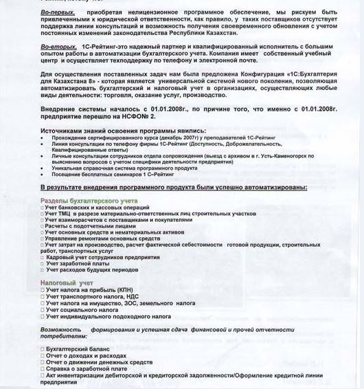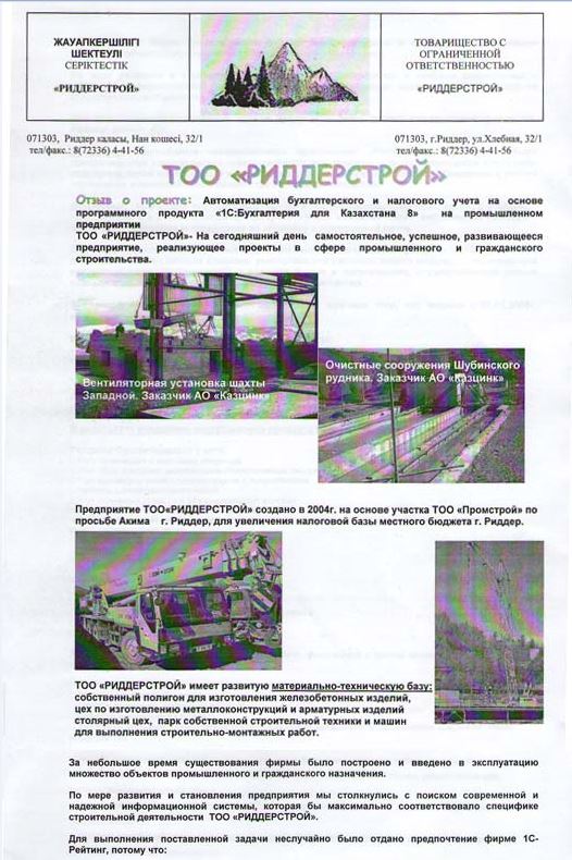 «Администрация ТОО «РИДДЕРСТРОЙ» благодарит компанию за квалифицированную работу и надеется на дальнейшее сотрудничество. Рекомендуем другим предприятиям для автоматизации учета с помощью «универсального» программного продукта «1С:Бухгалтерия для Казахстана 8» обращаться к специалистам компании «1С-Рейтинг».