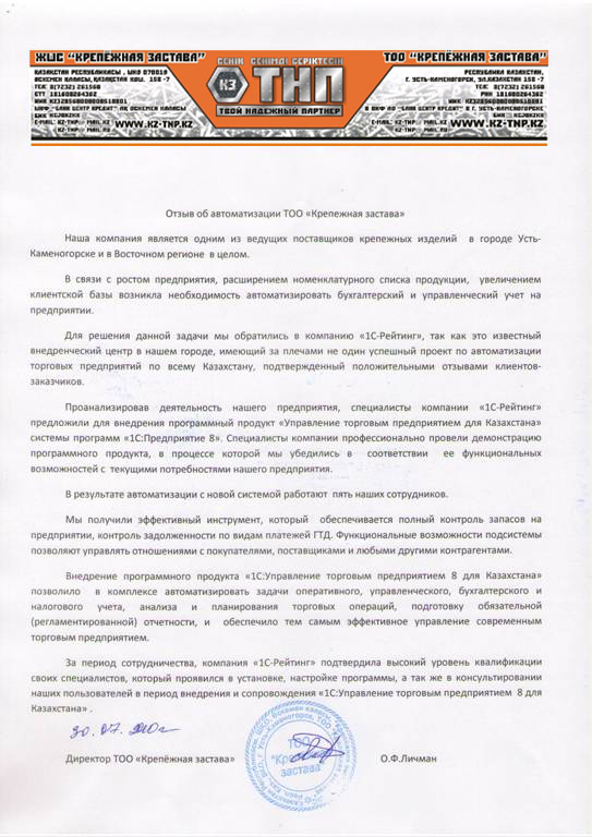 «Мы получили эффективный инструмент, который обеспечивается полный контроль запасов на предприятии, контроль задолженности по видам платежей ГТД. Функциональные возможности подсистемы позволяют управлять отношениями с покупателями, поставщиками и любыми другими контрагентами. За период сотрудничества, компания «1С-Рейтинг» подтвердила высокий уровень квалификации своих специалистов, который проявился в установке, настройке программы, а так же в консультировании наших пользователей в период внедрения и сопровождения «1С:Управление торговым предприятием 8 для Казахстана».