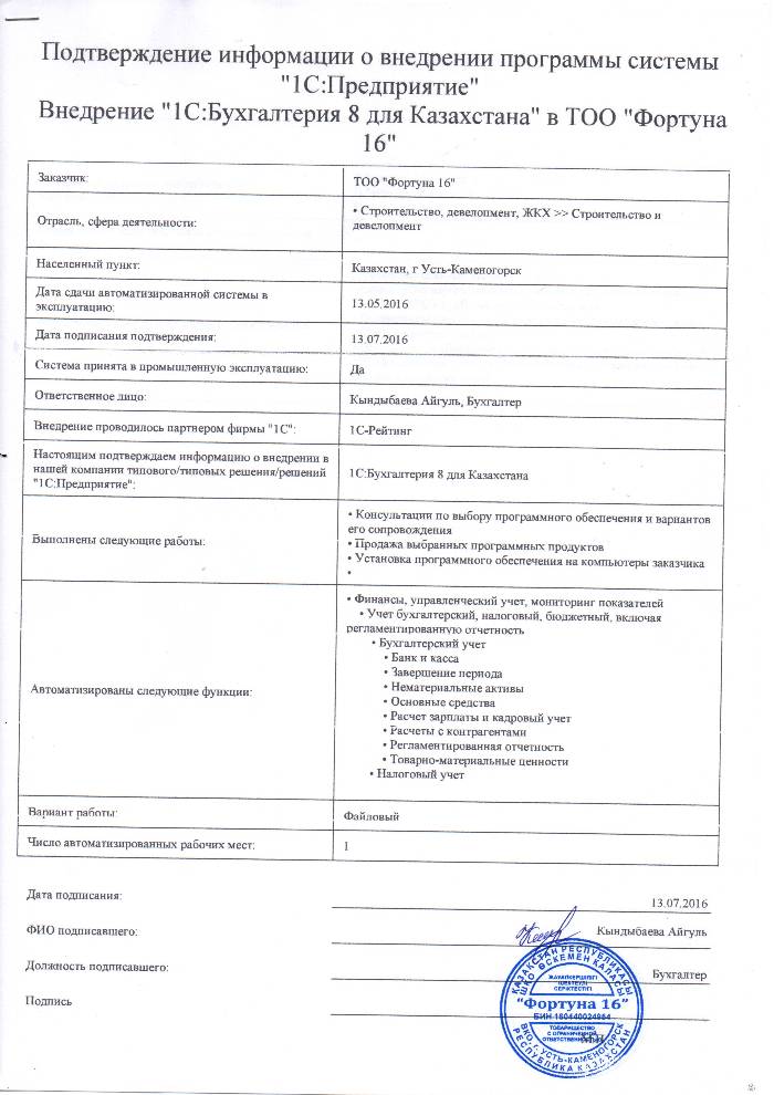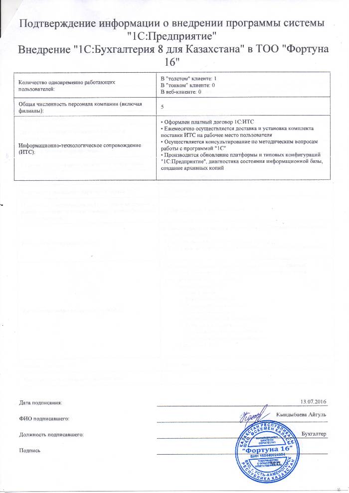 Внедрение «1С:Бухгалтерия 8 для Казахстана» в ТОО «Фортуна 16»