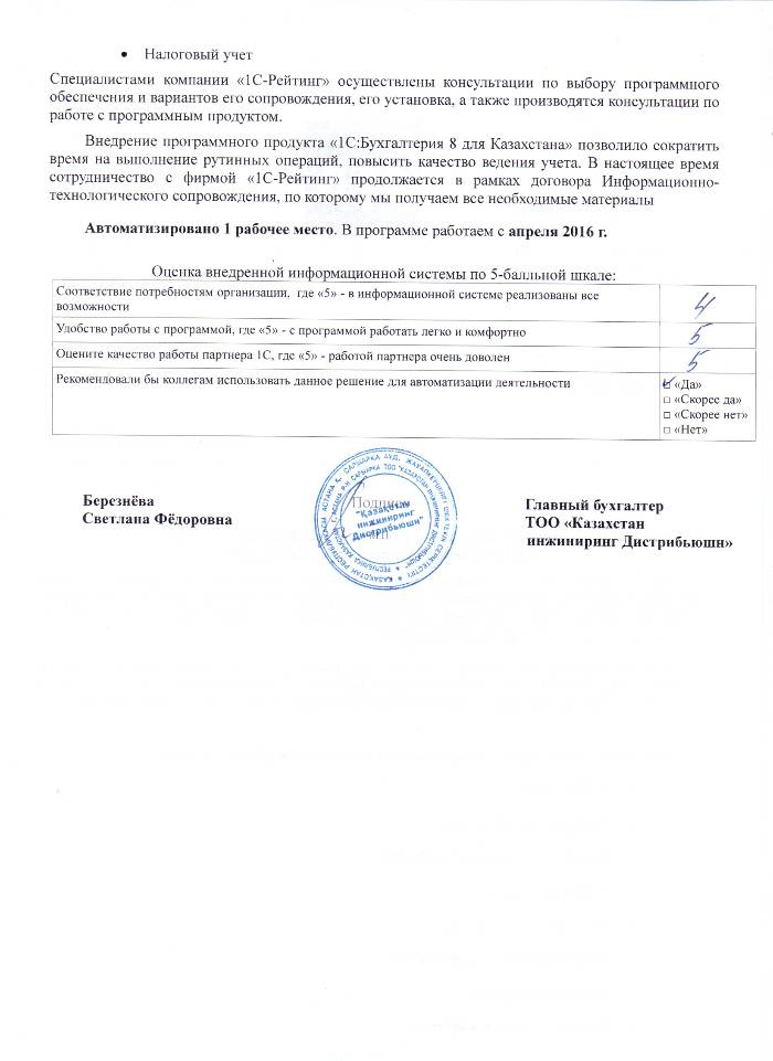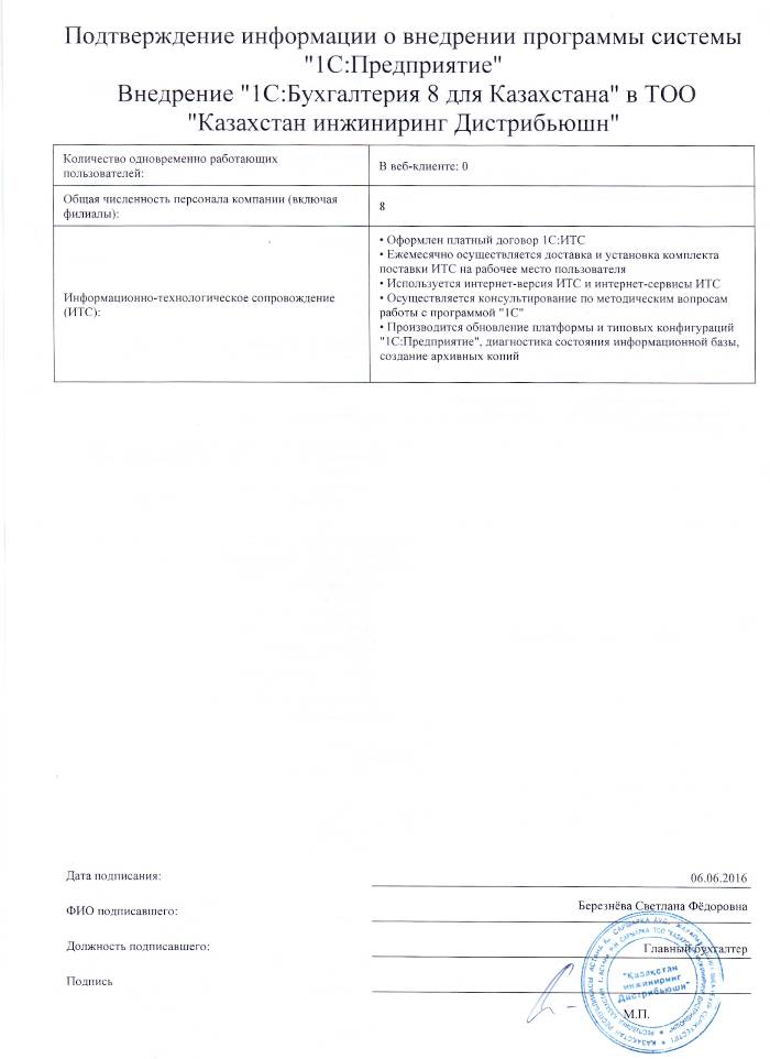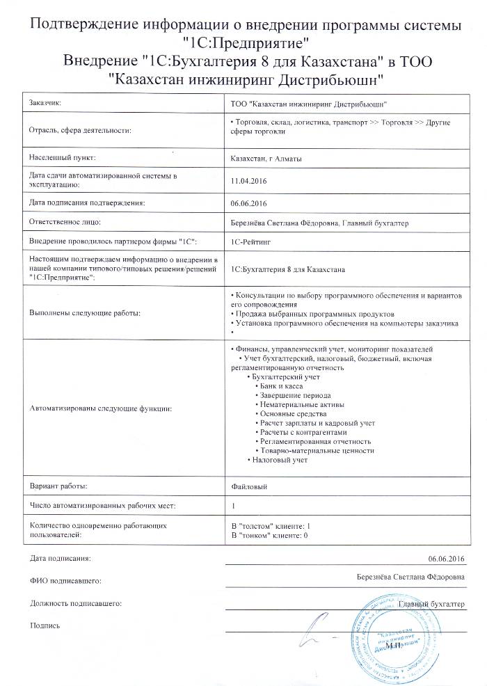 | Внедренное типовое решение: | 1С:Бухгалтерия 8 для Казахстана |