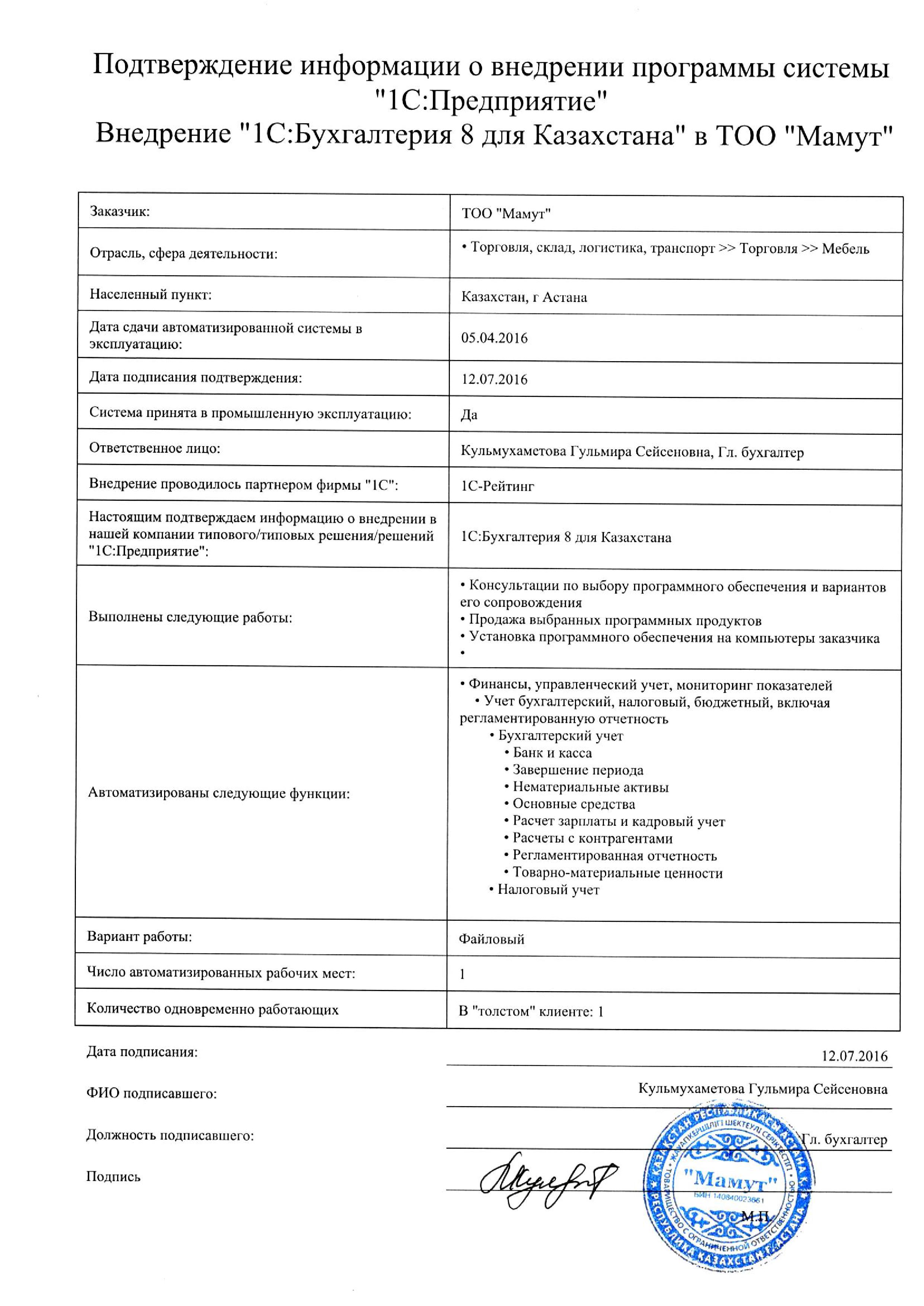 | Внедренное типовое решение: | 1С:Бухгалтерия 8 для Казахстана |