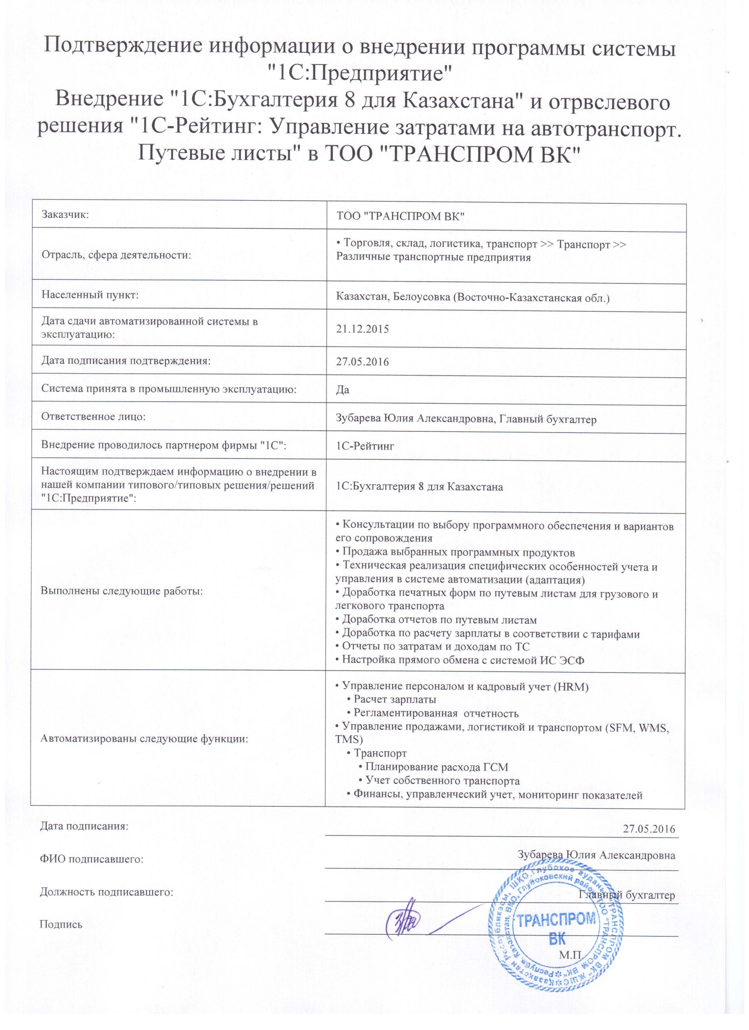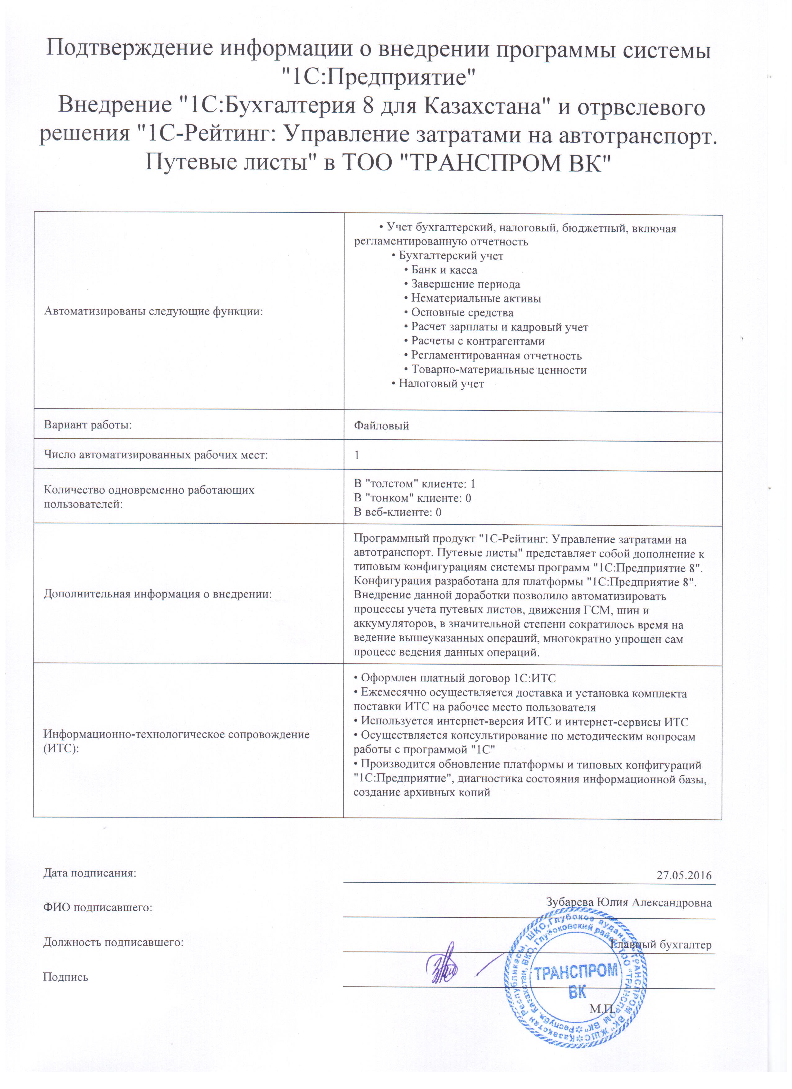 Программный продукт «1С-Рейтинг: Управление затратами на автотранспорт. Путевые листы» представляет собой дополнение к типовым конфигурациям системы программ «1С:Предприятие 8». Конфигурация разработана для платформы «1С:Предприятие 8». Внедрение данной доработки позволило автоматизировать процессы учета путевых листов, движения ГСМ, шин и аккумуляторов, в значительной степени сократилось время на ведение вышеуказанных операций, многократно упрощен сам процесс ведения данных операций.