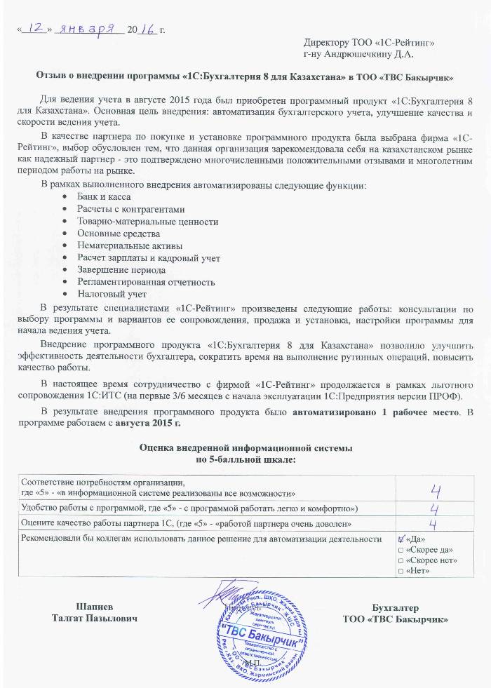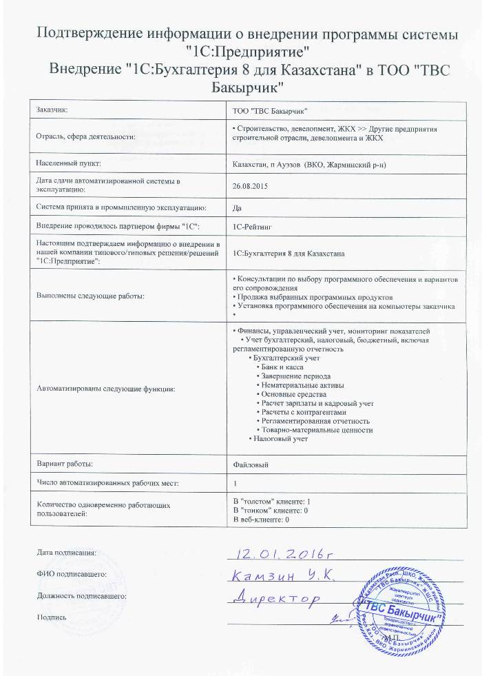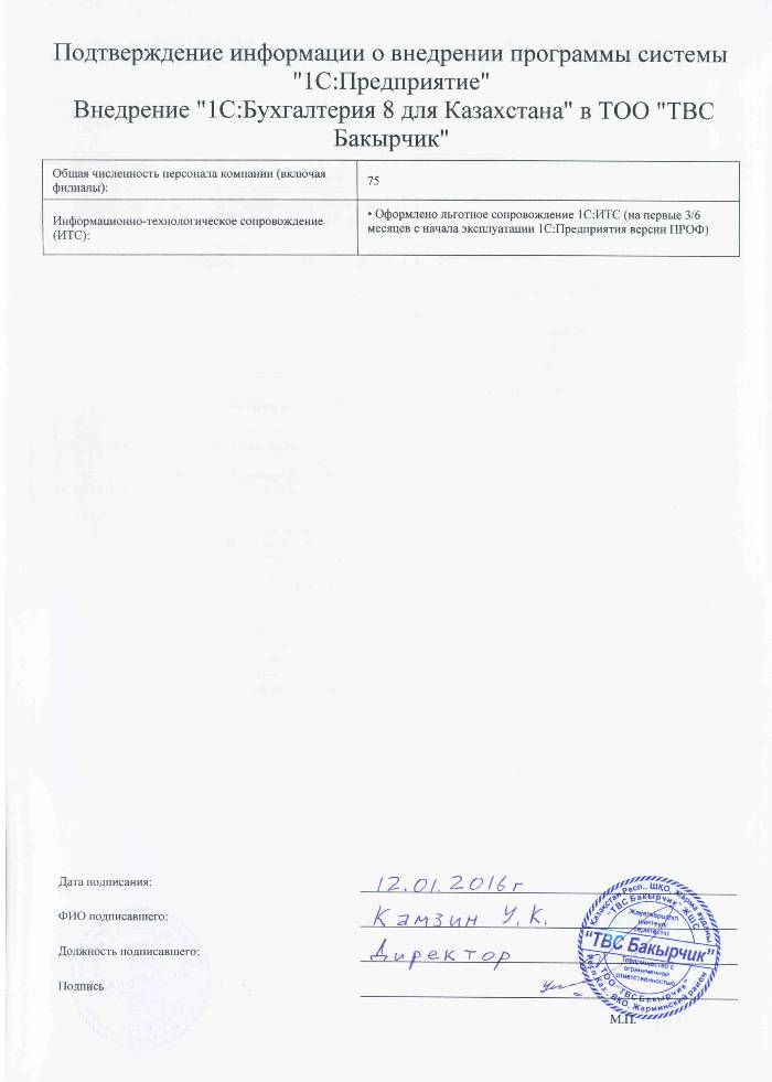 | Внедренное типовое решение: | 1С:Бухгалтерия 8 для Казахстана |