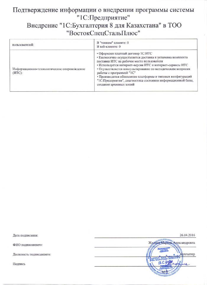 | Внедренное типовое решение: | 1С:Бухгалтерия 8 для Казахстана |
