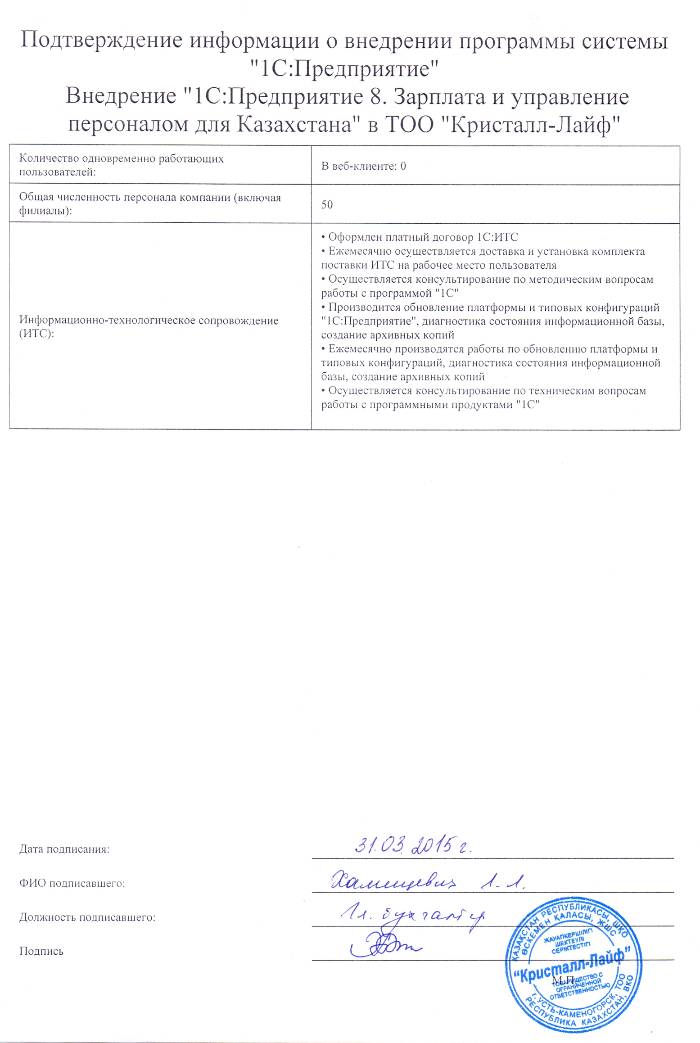 | Внедренное типовое решение: | 1С:Зарплата и управление персоналом 8 для Казахстана |