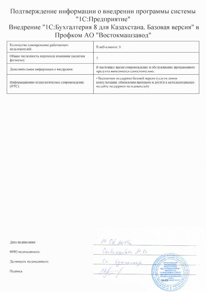 | Внедренное типовое решение: | 1С:Бухгалтерия 8 для Казахстана. Базовая версия |