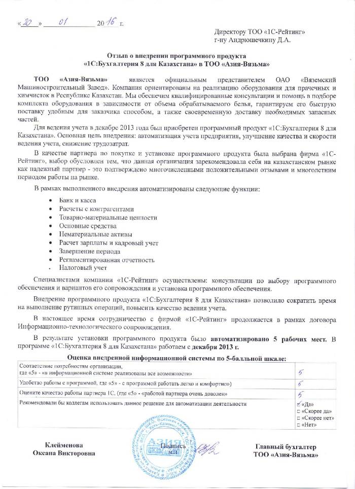 | Внедренное типовое решение: | 1С:Бухгалтерия 8 для Казахстана |