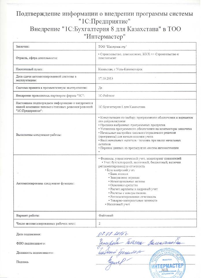 Внедрение 1С:Бухгалтерия 8 для Казахстана в ТОО Интермастер