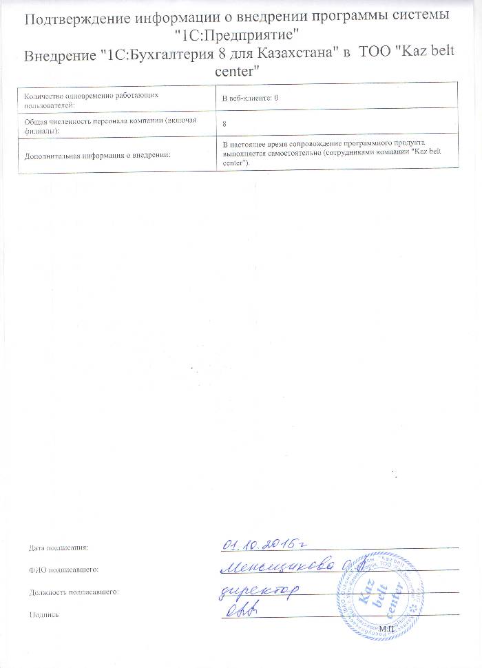 | Внедренное типовое решение: | 1С:Бухгалтерия 8 для Казахстана |