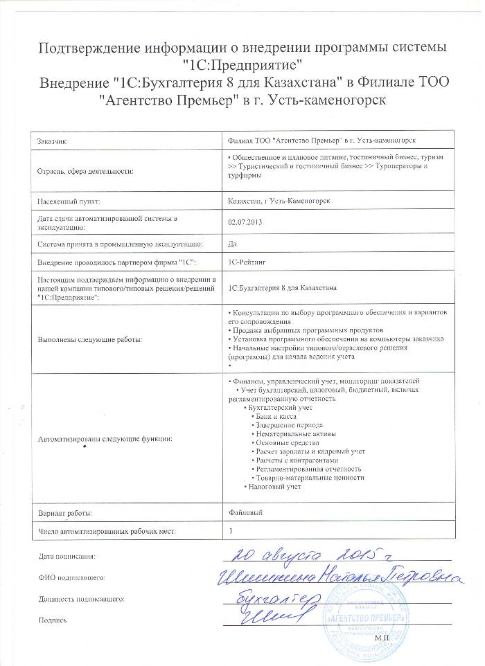 | Внедренное типовое решение: | 1С:Бухгалтерия 8 для Казахстана |