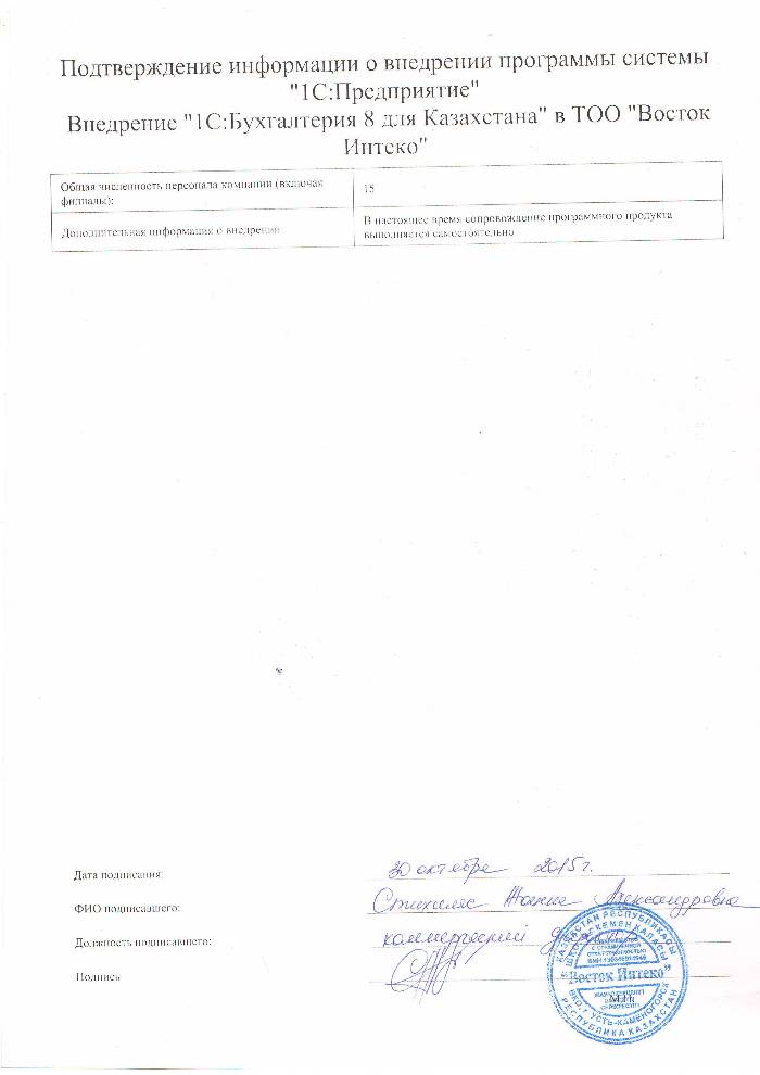 | Внедренное типовое решение: | 1С:Бухгалтерия 8 для Казахстана |