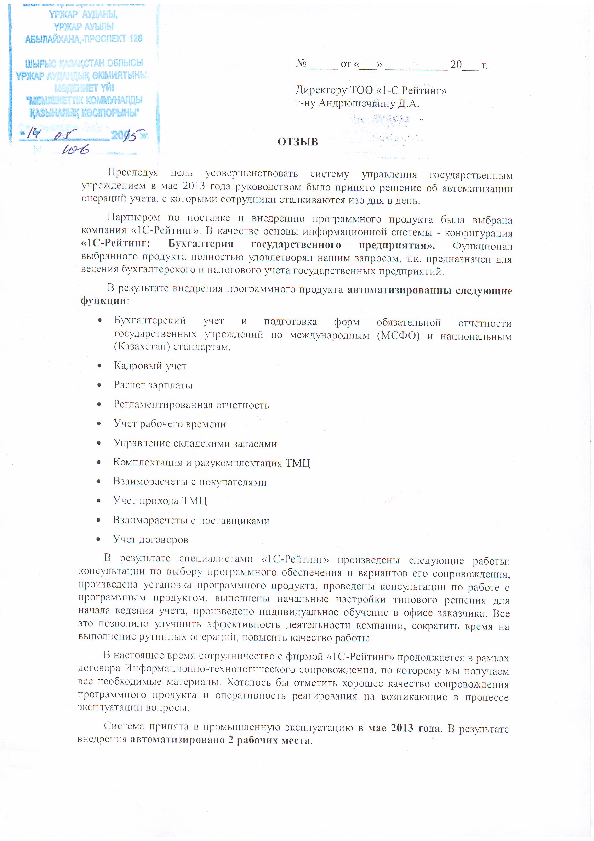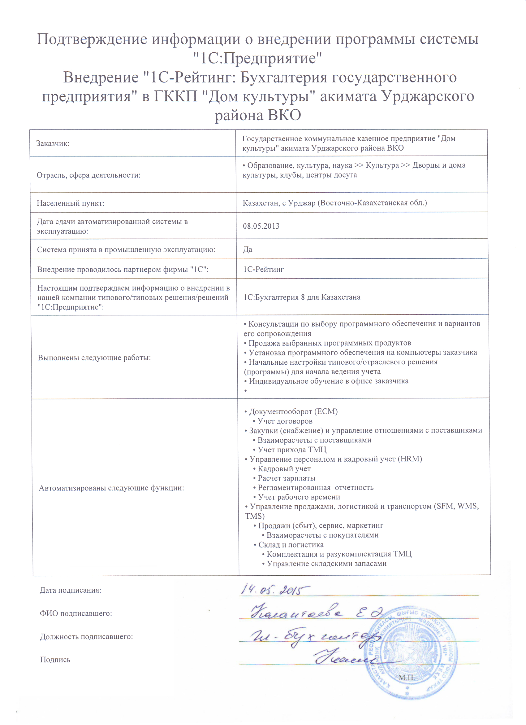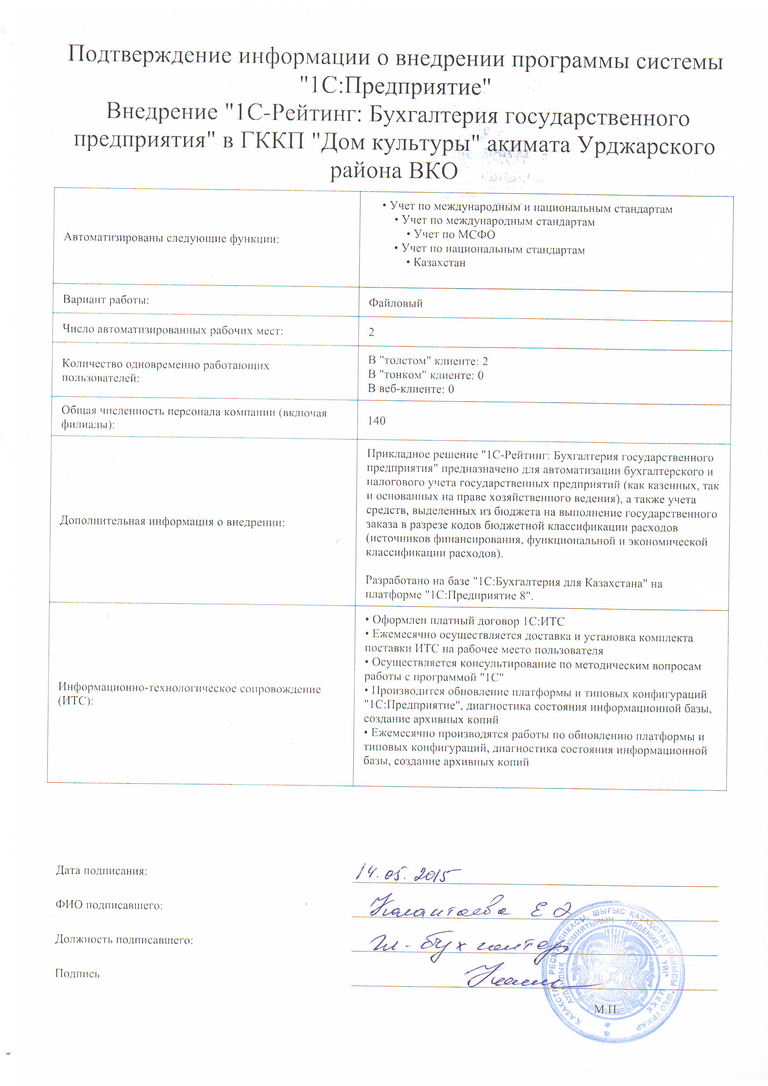 | Внедренное отраслевое решение: | 1С-Рейтинг: Бухгалтерия государственного предприятия |