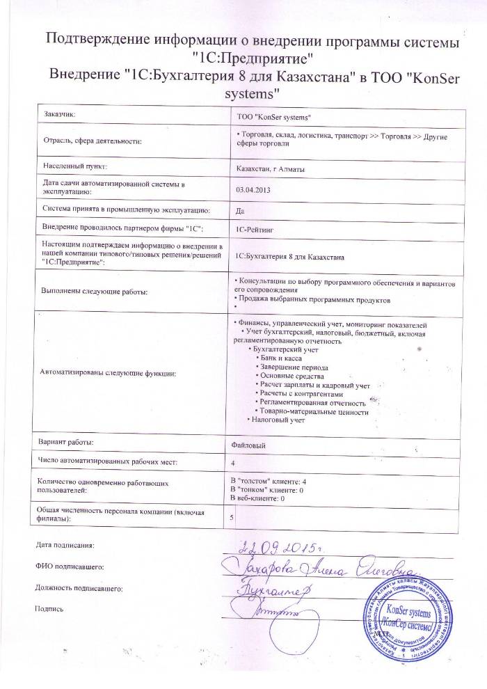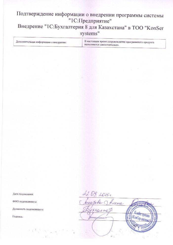 | Внедренное типовое решение: | 1С:Бухгалтерия 8 для Казахстана |