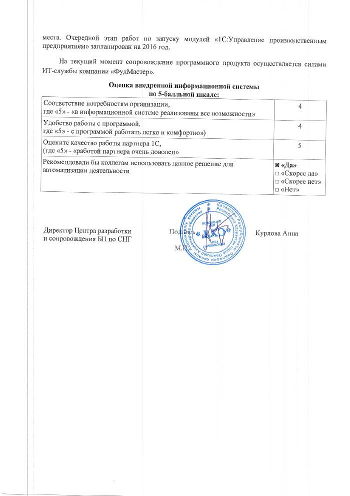 Программный продукт «1С:Управление производственным предприятием 8 для Казахстана» приобретен у давнего партнера компании «ФудМастер» — ТОО «1С-Рейтинг», сотрудничество с данной фирмой насчитывает более 10 лет, в рамках данного сотрудничества автоматизировано не одно предприятие входящее в состав холдинга.