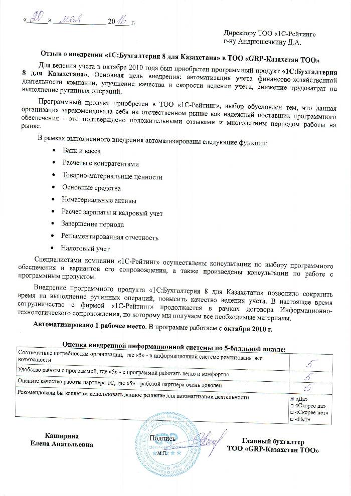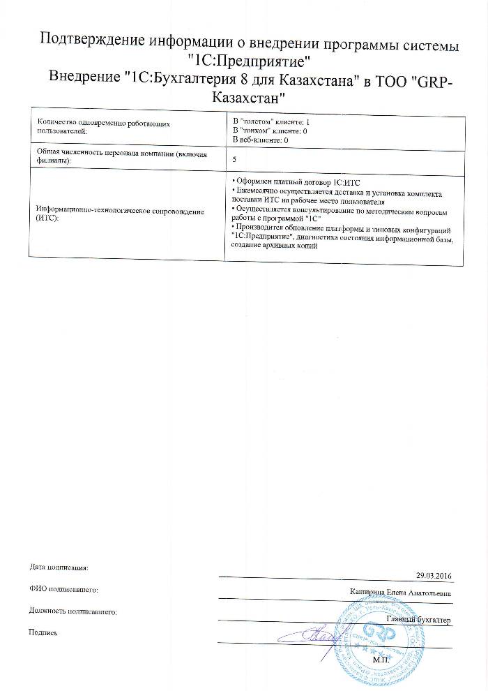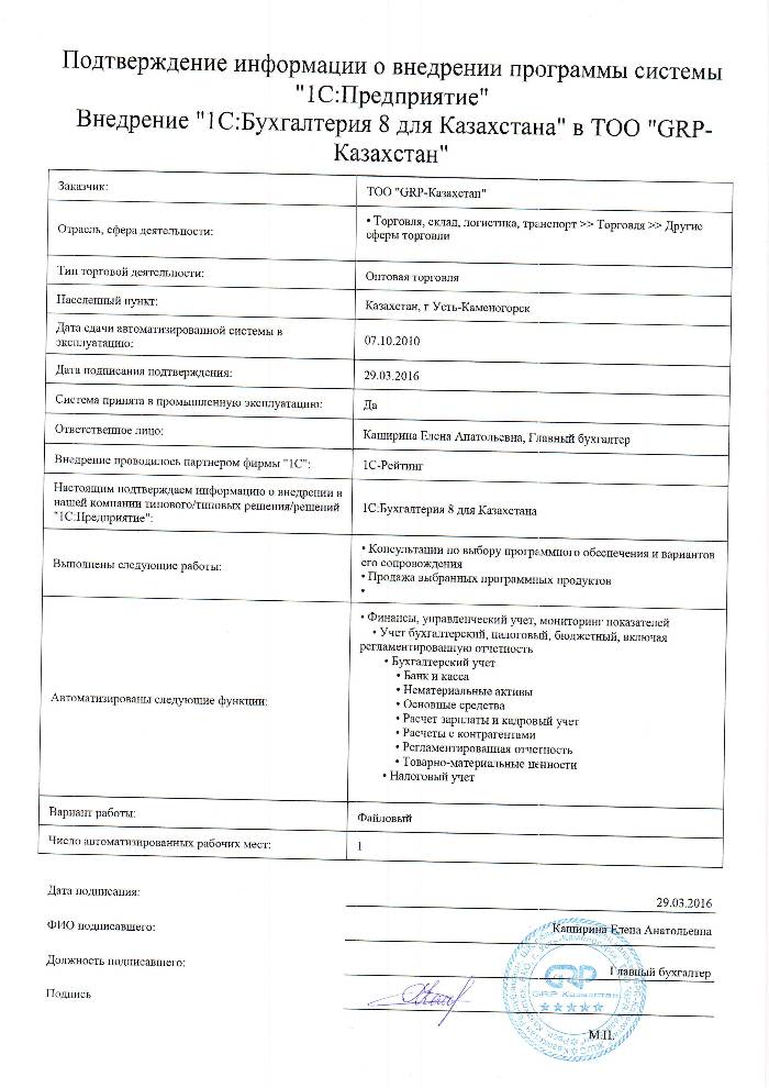 | Внедренное типовое решение: | 1С:Бухгалтерия 8 для Казахстана |