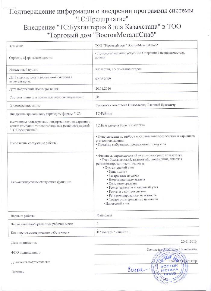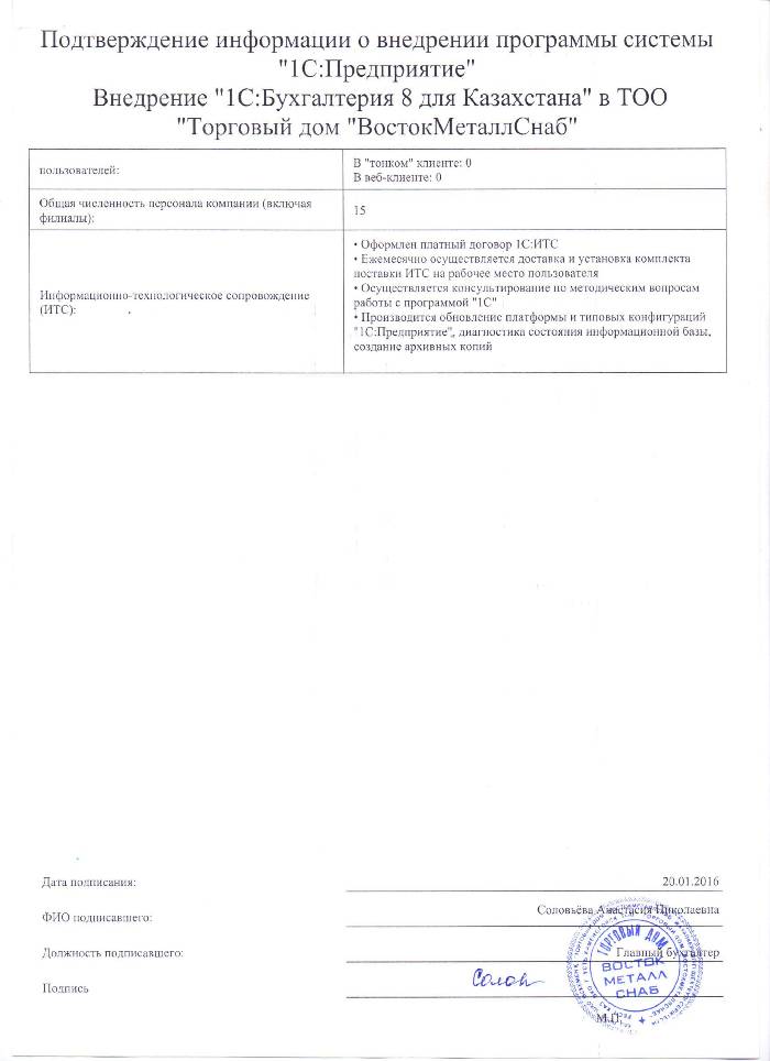 | Внедренное типовое решение: | 1С:Бухгалтерия 8 для Казахстана |