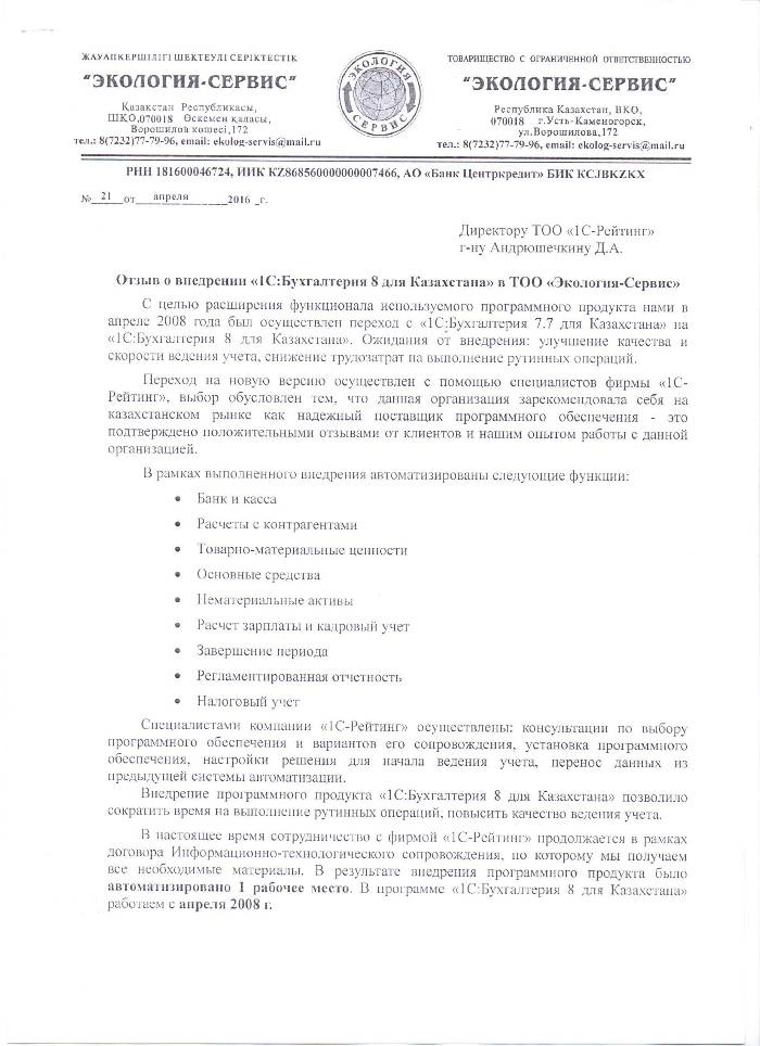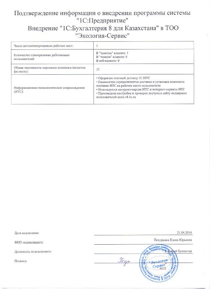 | Внедренное типовое решение: | 1С:Бухгалтерия 8 для Казахстана |