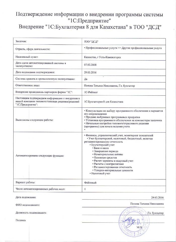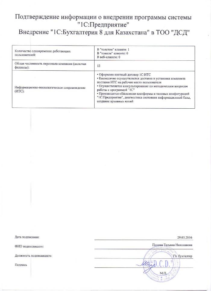 | Внедренное типовое решение: | 1С:Бухгалтерия 8 для Казахстана |