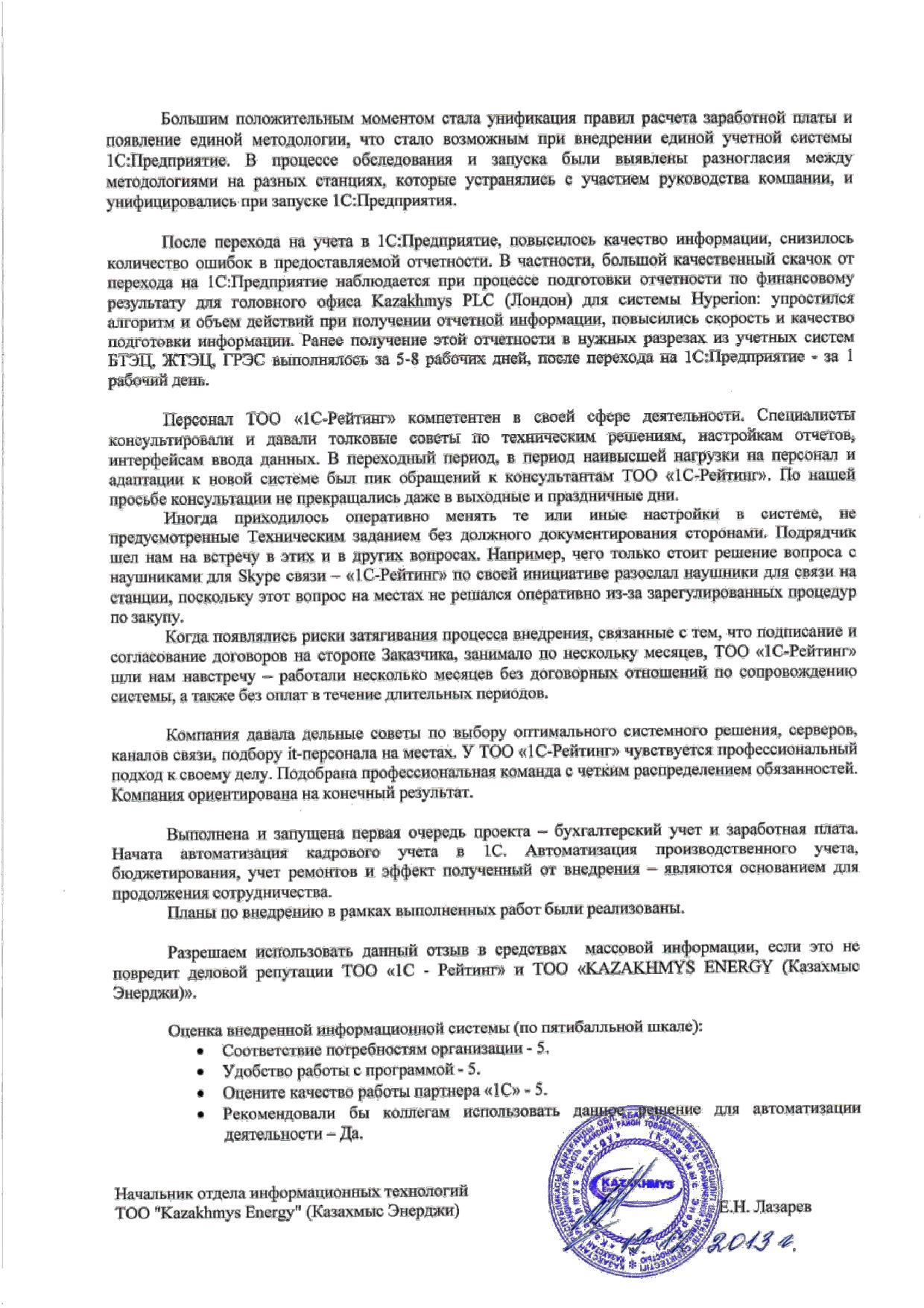 На стадии выбора подрядчика под внедрение новой учетной системы, был проведен ряд встреч с представителями крупных компаний, специализирующихся на учетной системе 1С, получены от них коммерческие предложения, получена информация о крупных и успешных внедрениях, наличии квалифицированного персонала. В результате полученных сведений, было принято коллегиальное решение сделать выбор в пользу ТОО «1С-Рейтинг». Мониторинг рынка Компаний, специализирующихся на комплексных решениях 1С, показал, что по ряду показателей, ТОО «1С-Рейтинг» имеет ряд преимуществ, не только в ценовой политике, но и благодаря системному подходу документирования этапов работ, умению долгосрочного планирования событий по внедрению.
