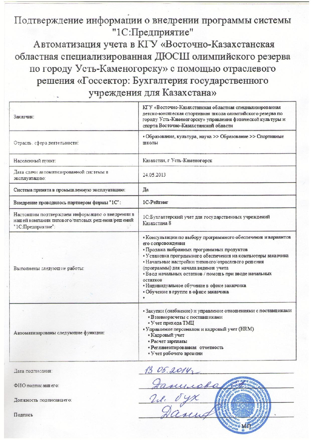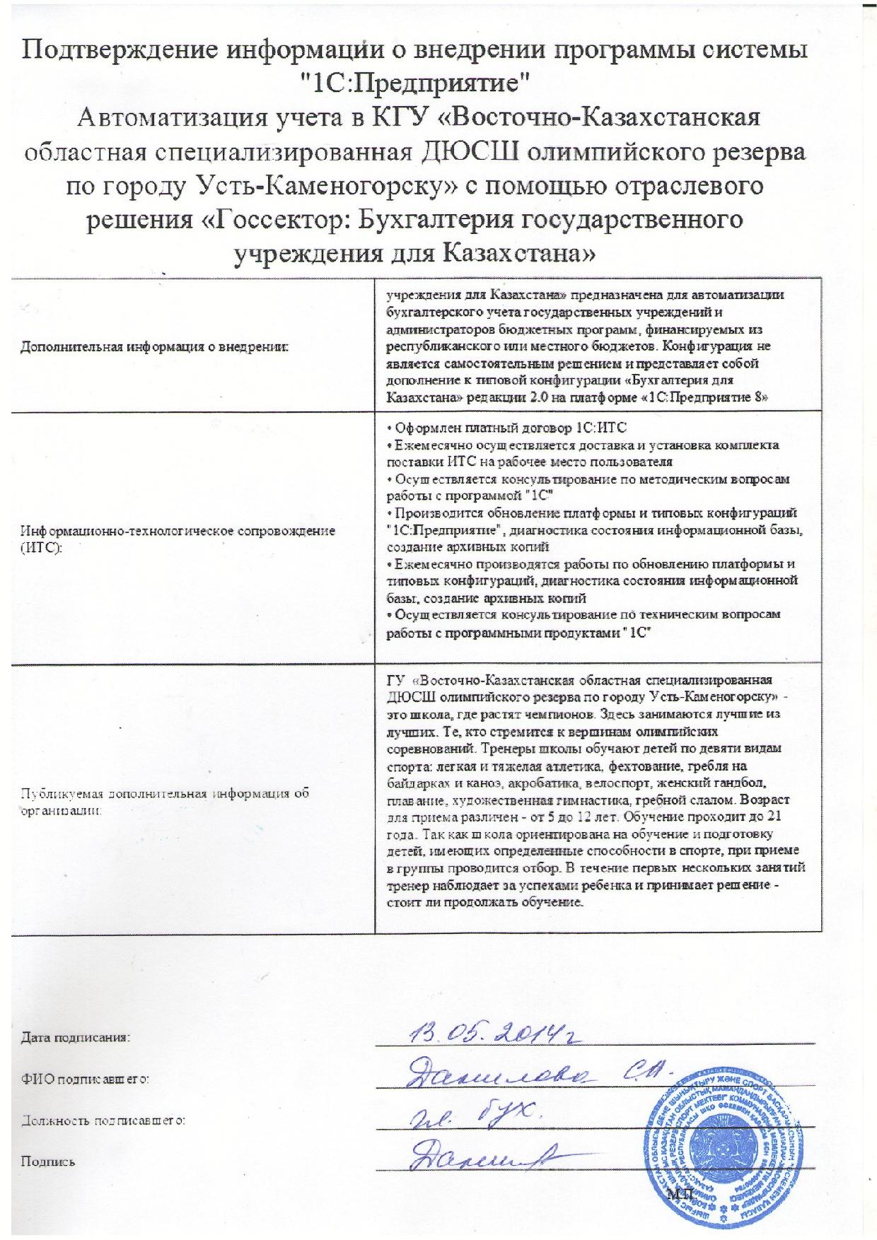 Внедрение «Госсектор: Бухгалтерия государственного учреждения для Казахстана» в КГУ «Восточно-Казахстанская областная специализированная ДЮСШ олимпийского резерва по городу Усть-Каменогорску»