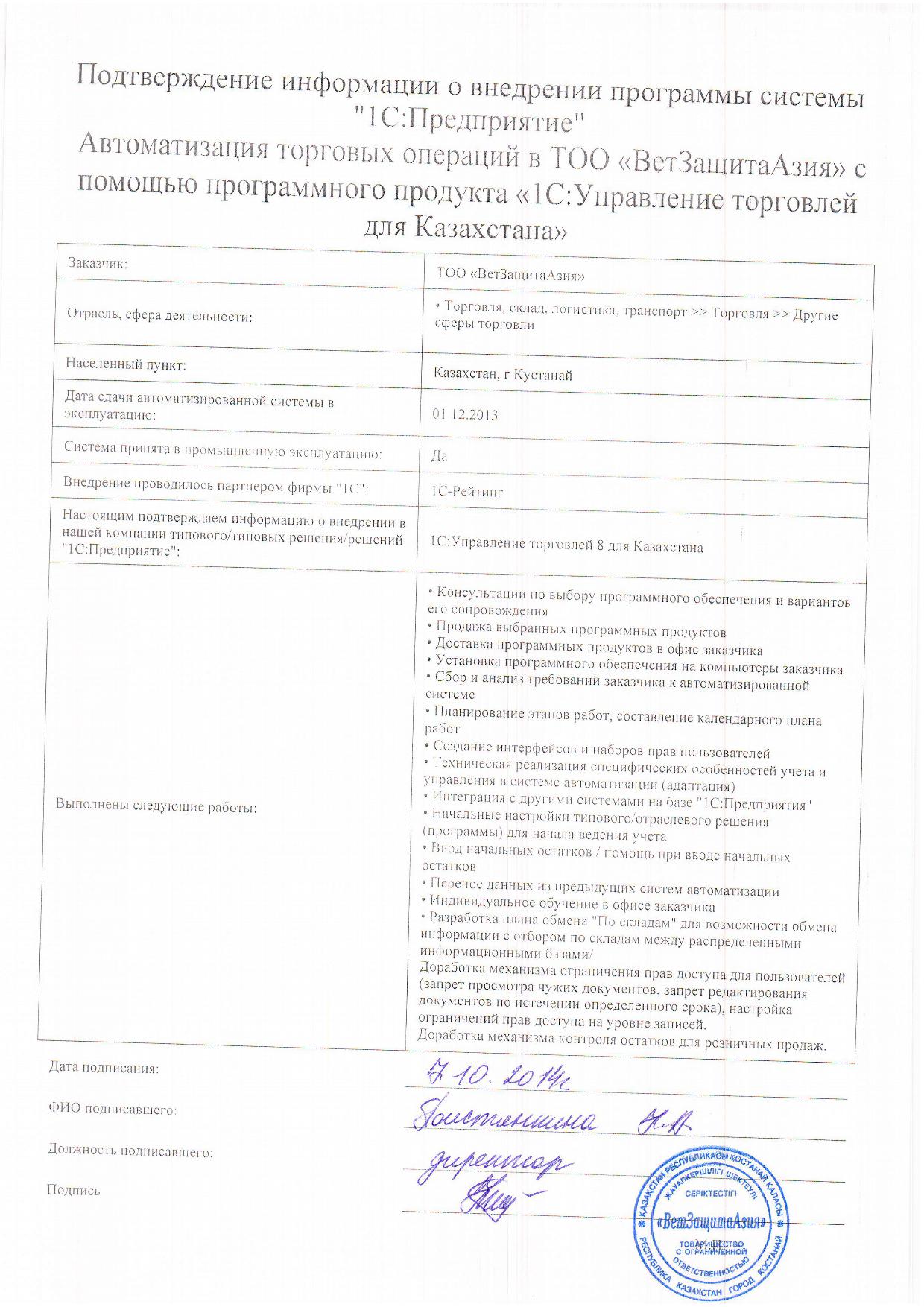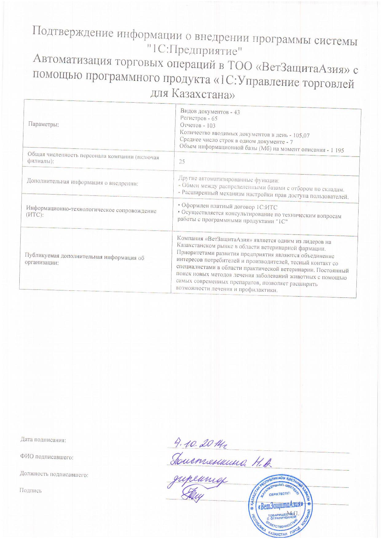 | Внедренное типовое решение: | 1С:Управление торговлей 8 для Казахстана |