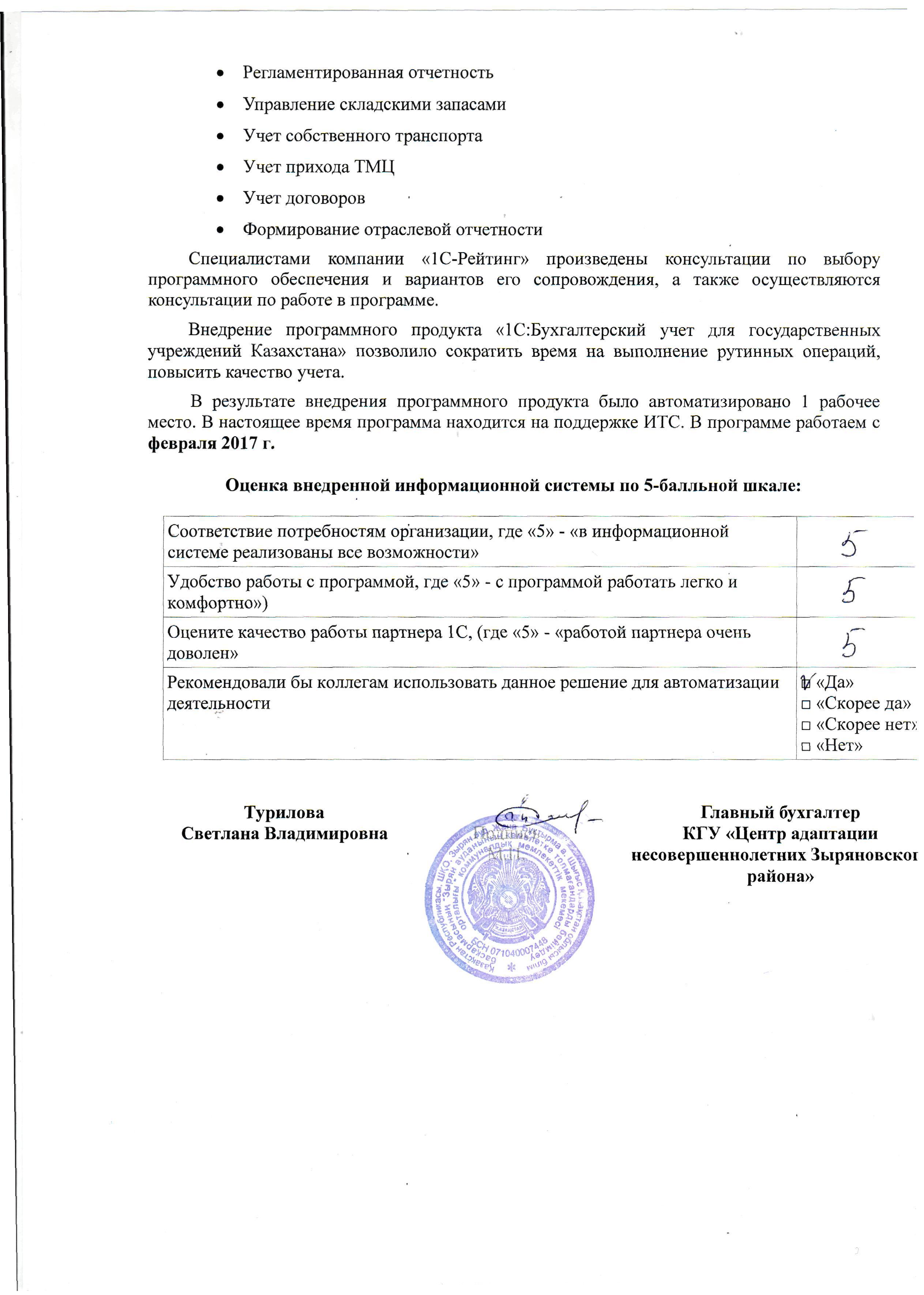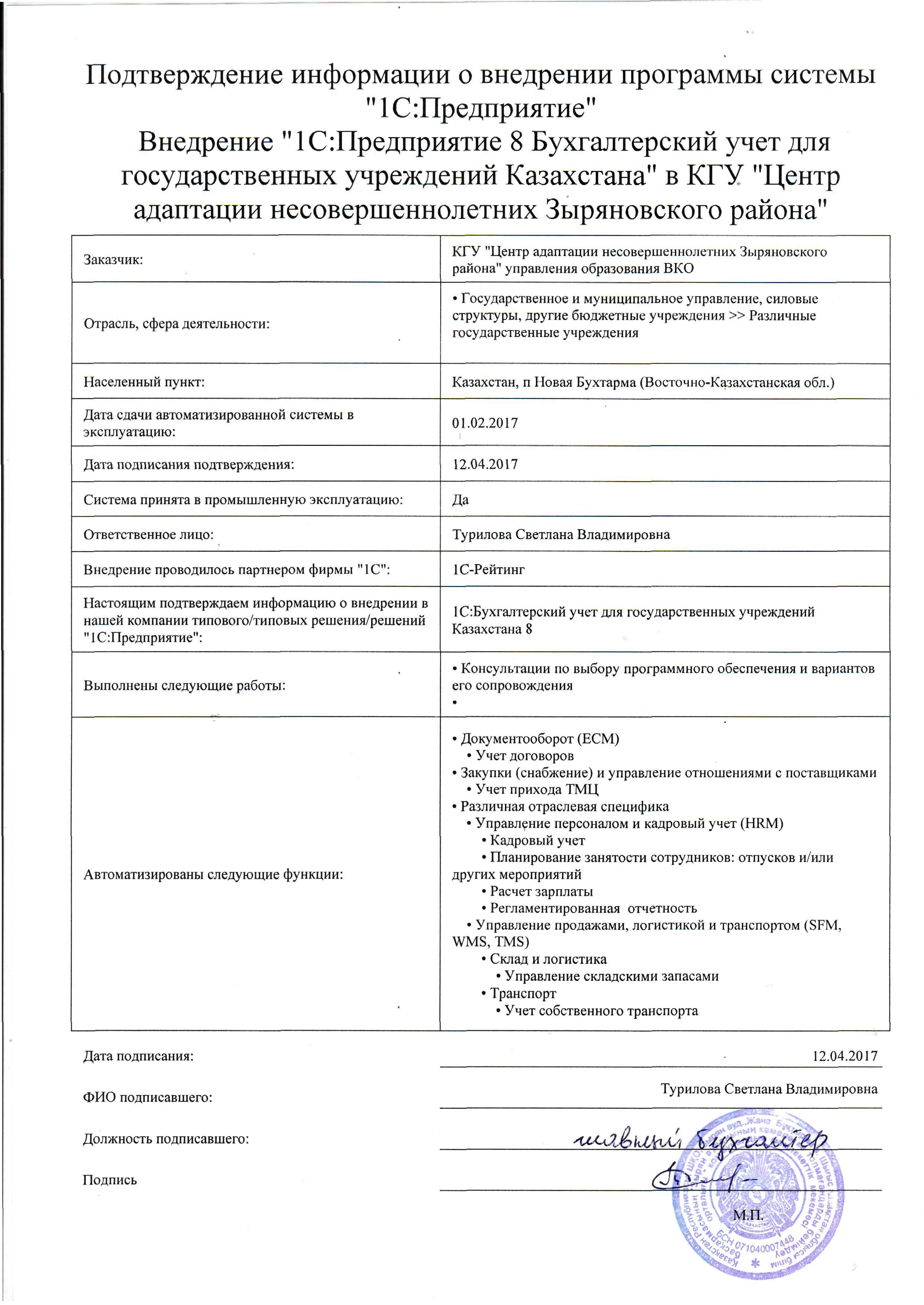 | Внедренное решение: | 1С:Бухгалтерский учет для государственных учреждений Казахстана |