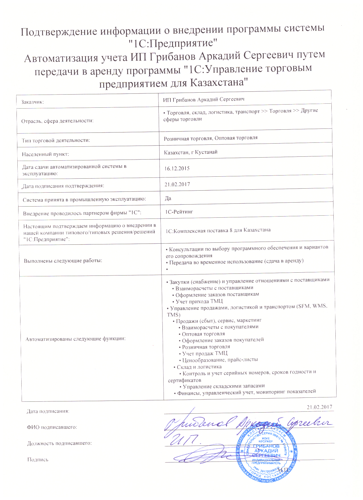 | Арендованное типовое решение: | 1С:Управление торговым предприятием для Казахстана |