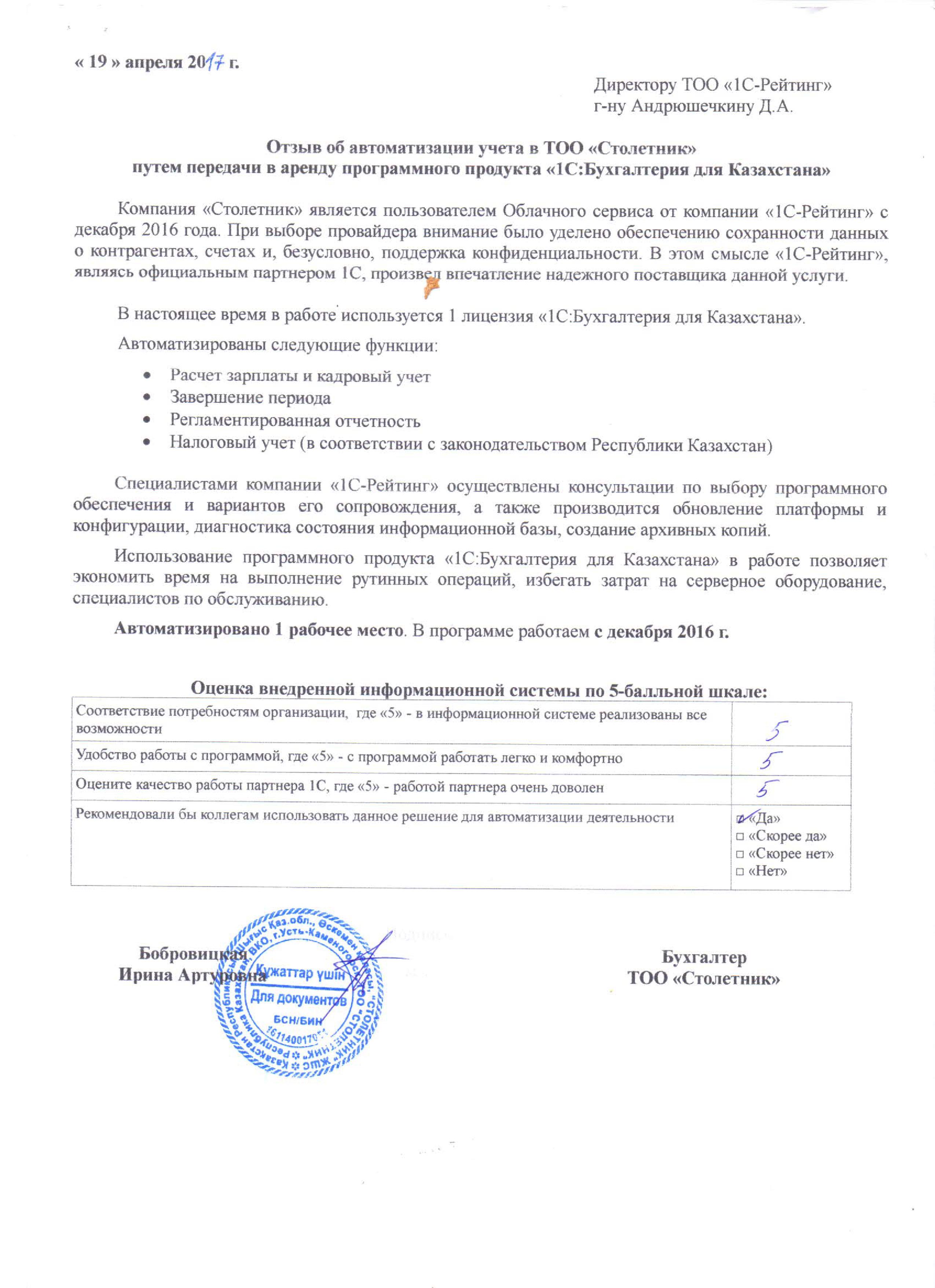 | Арендованное типовое решение: | 1С:Бухгалтерия для Казахстана |