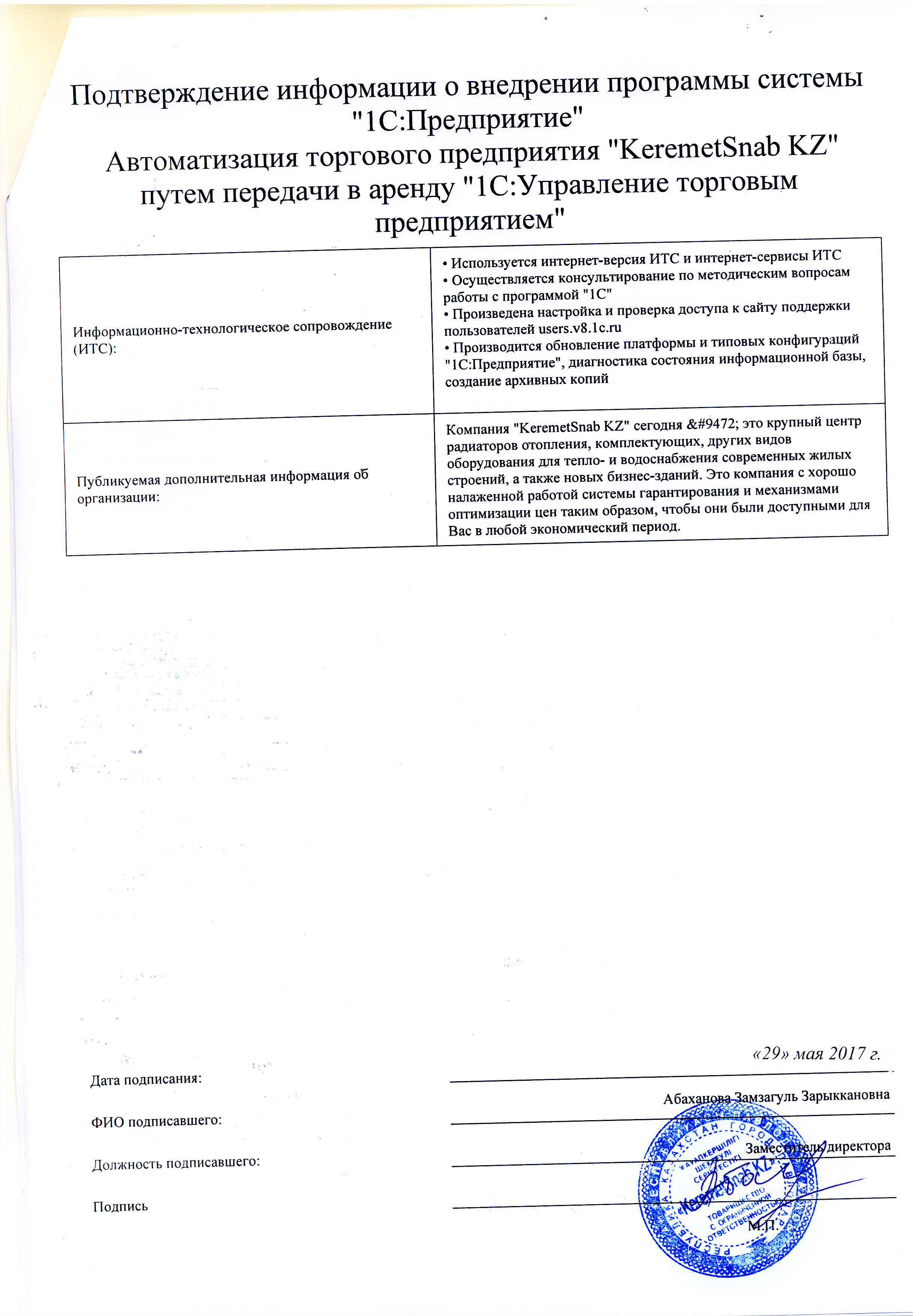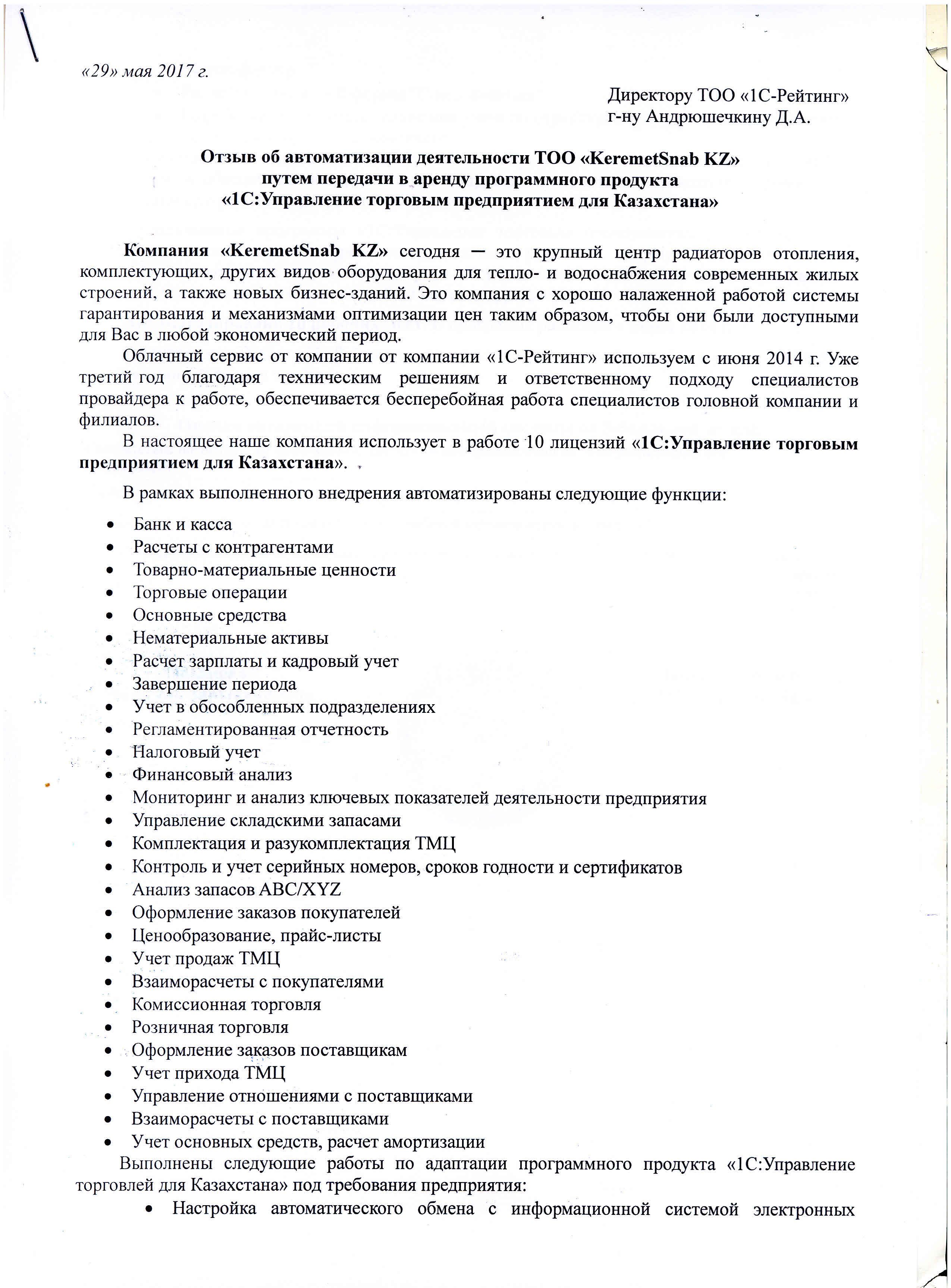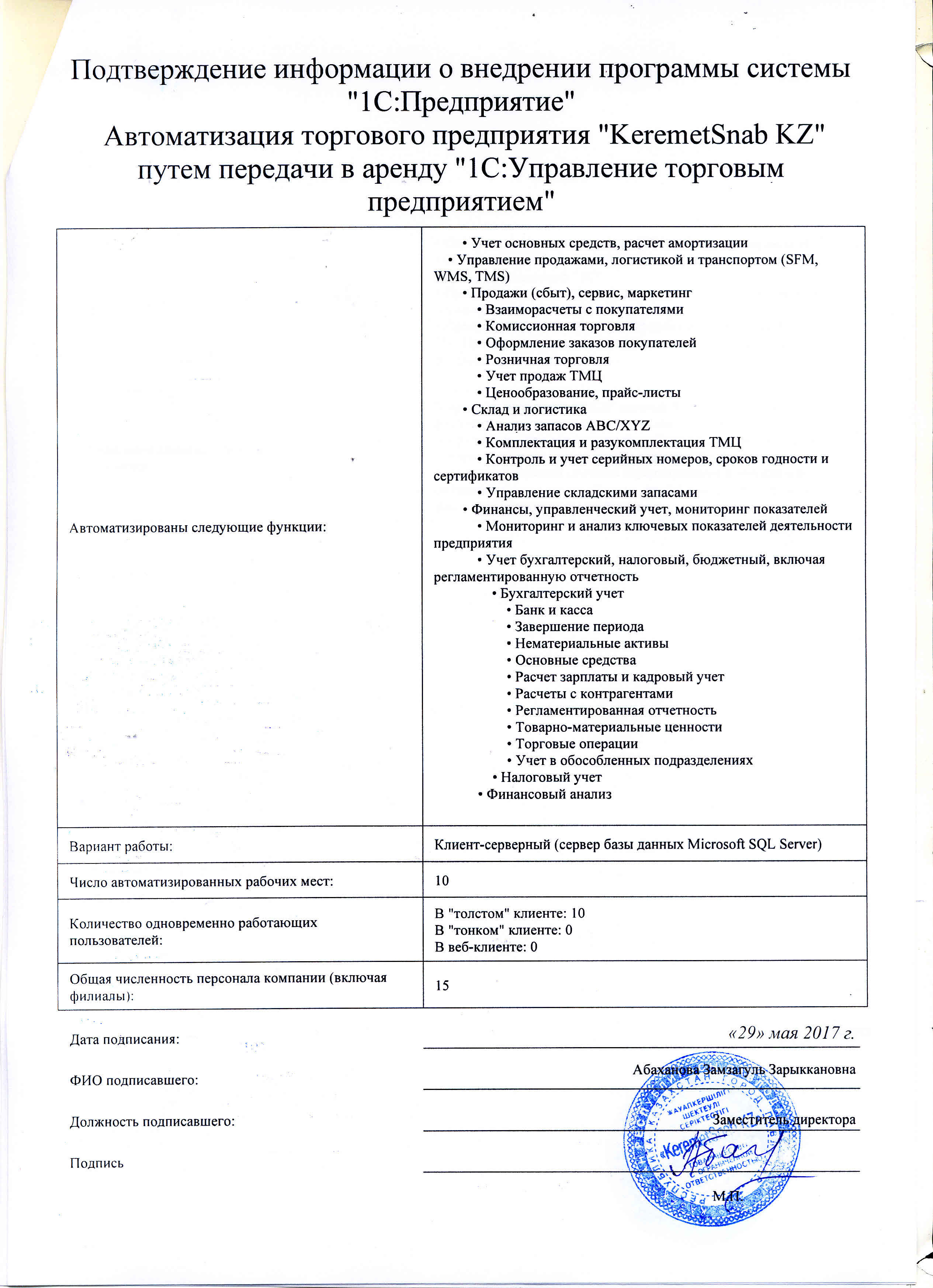 | Арендованное типовое решение: | 1С:Управление торговым предприятием для Казахстана |