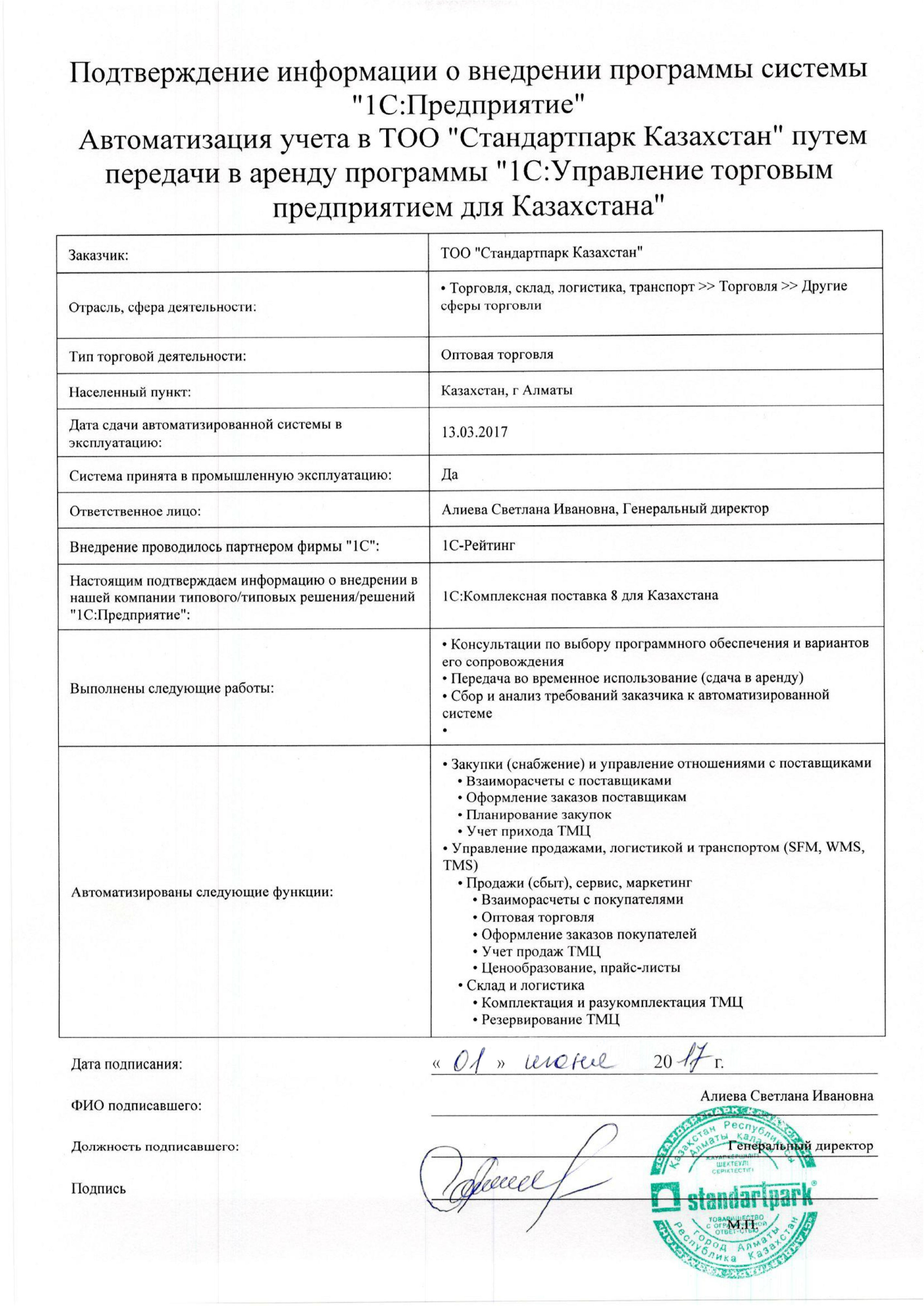 | Арендованное типовое решение: | 1С:Управление торговым предприятием для Казахстана |
