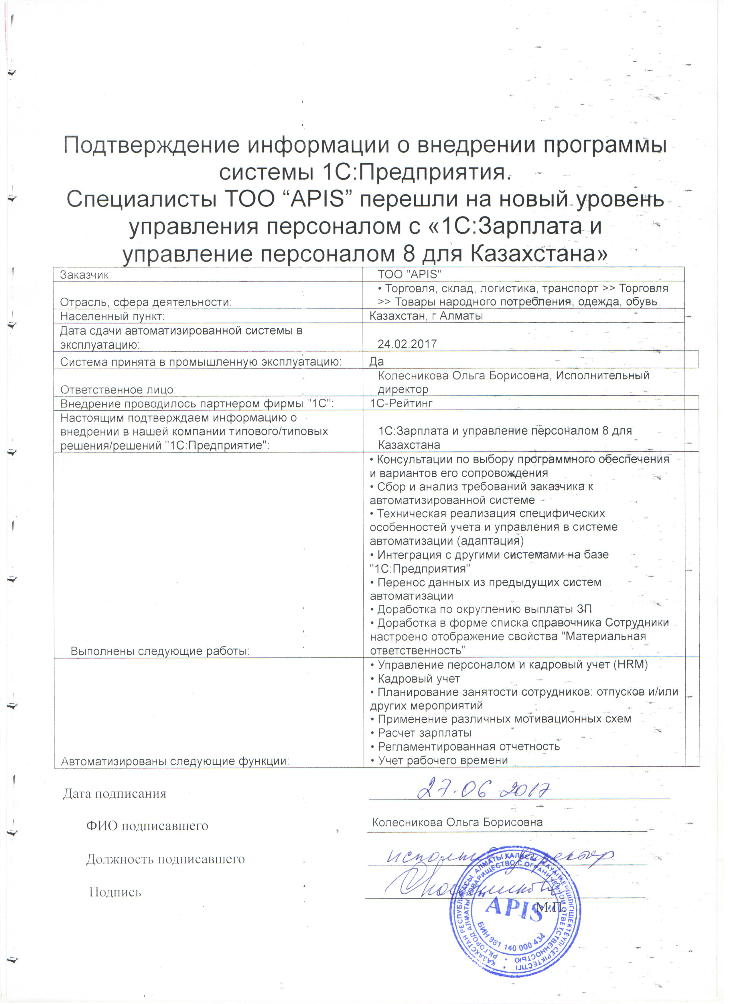 Специалисты ТОО «APIS» перешли на новый уровень управления персоналом с «1С:Зарплата и управление персоналом 8 для Казахстана»