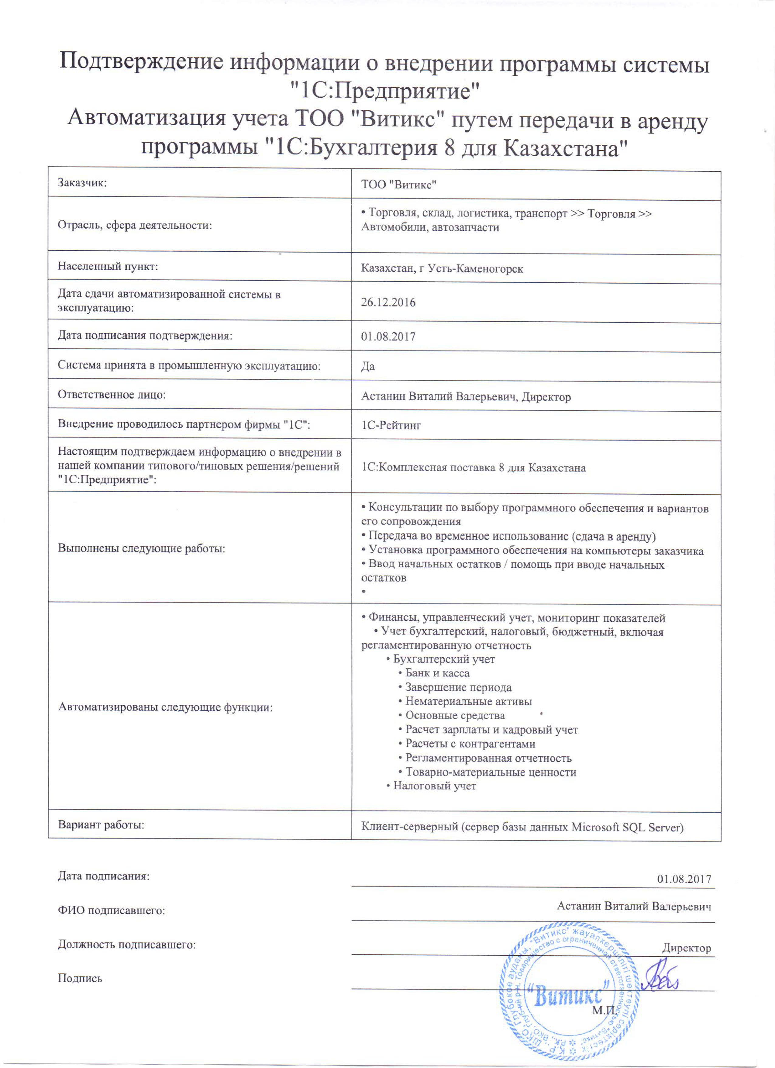 | Арендованное типовое решение: | 1С:Бухгалтерия для Казахстана |