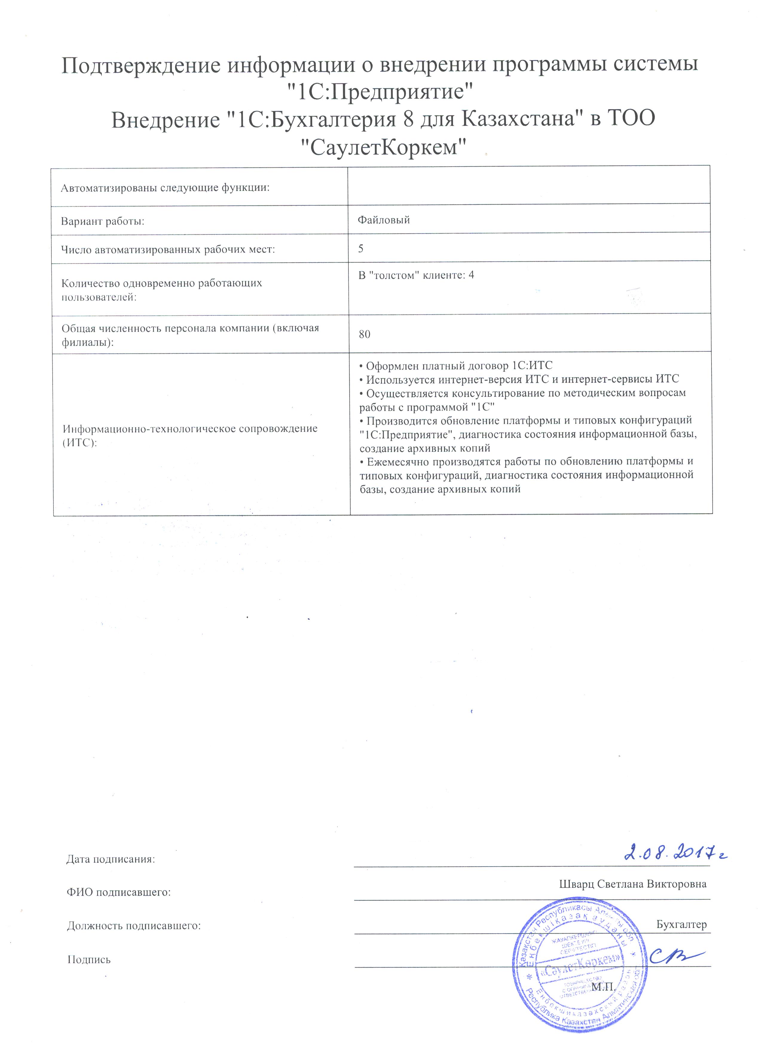 | Внедренное типовое решение: | 1С:Бухгалтерия 8 для Казахстана |