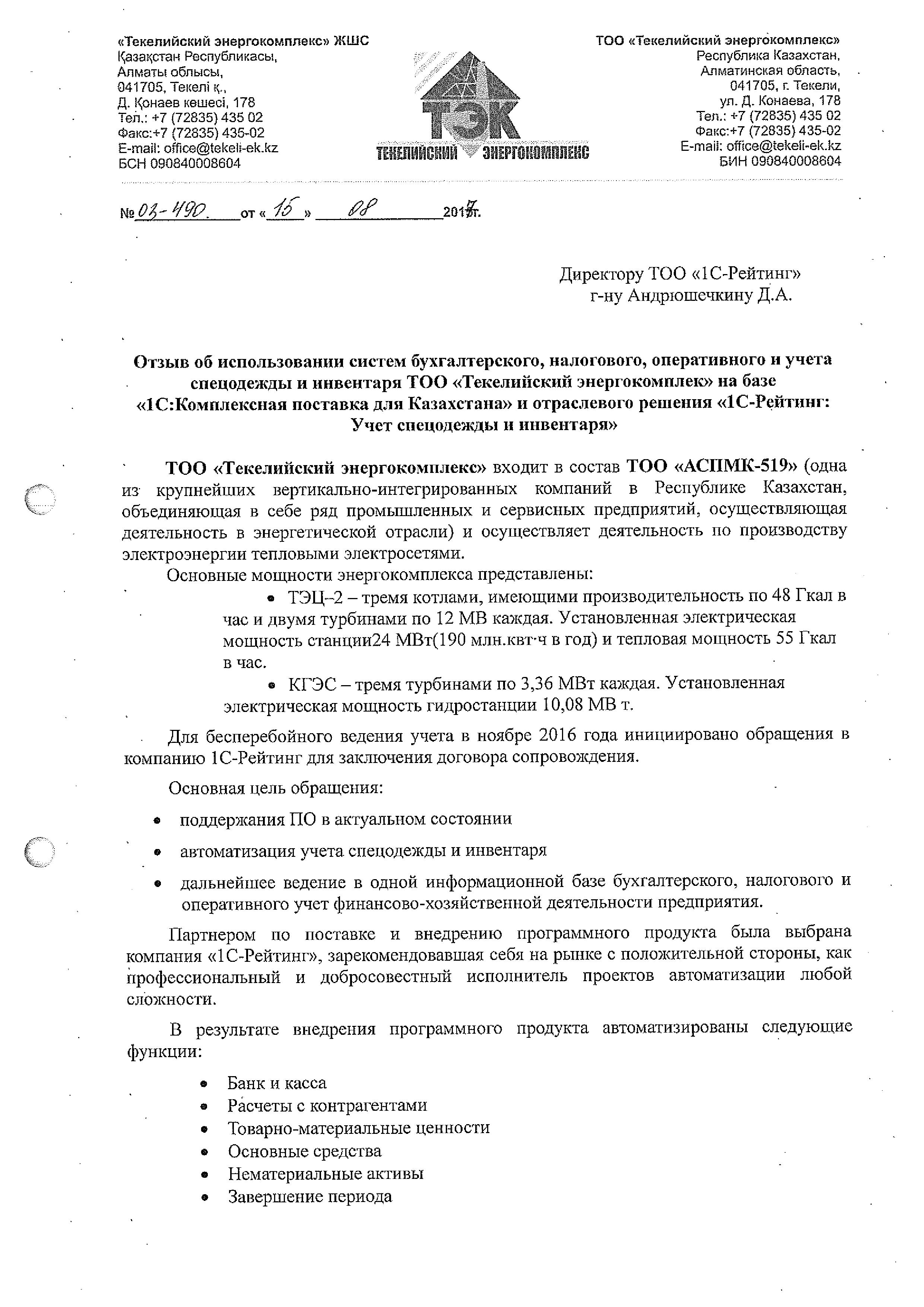 ТОО «Текелийский энергокомплекс» входит в состав ТОО «АСПМК-519» (одна из крупнейших вертикально-интегрированных компаний в Республике Казахстан, объединяющая в себе ряд промышленных и сервисных предприятий, осуществляющая деятельность в энергетической отрасли) и осуществляет деятельность по производству электроэнергии тепловыми электросетями.