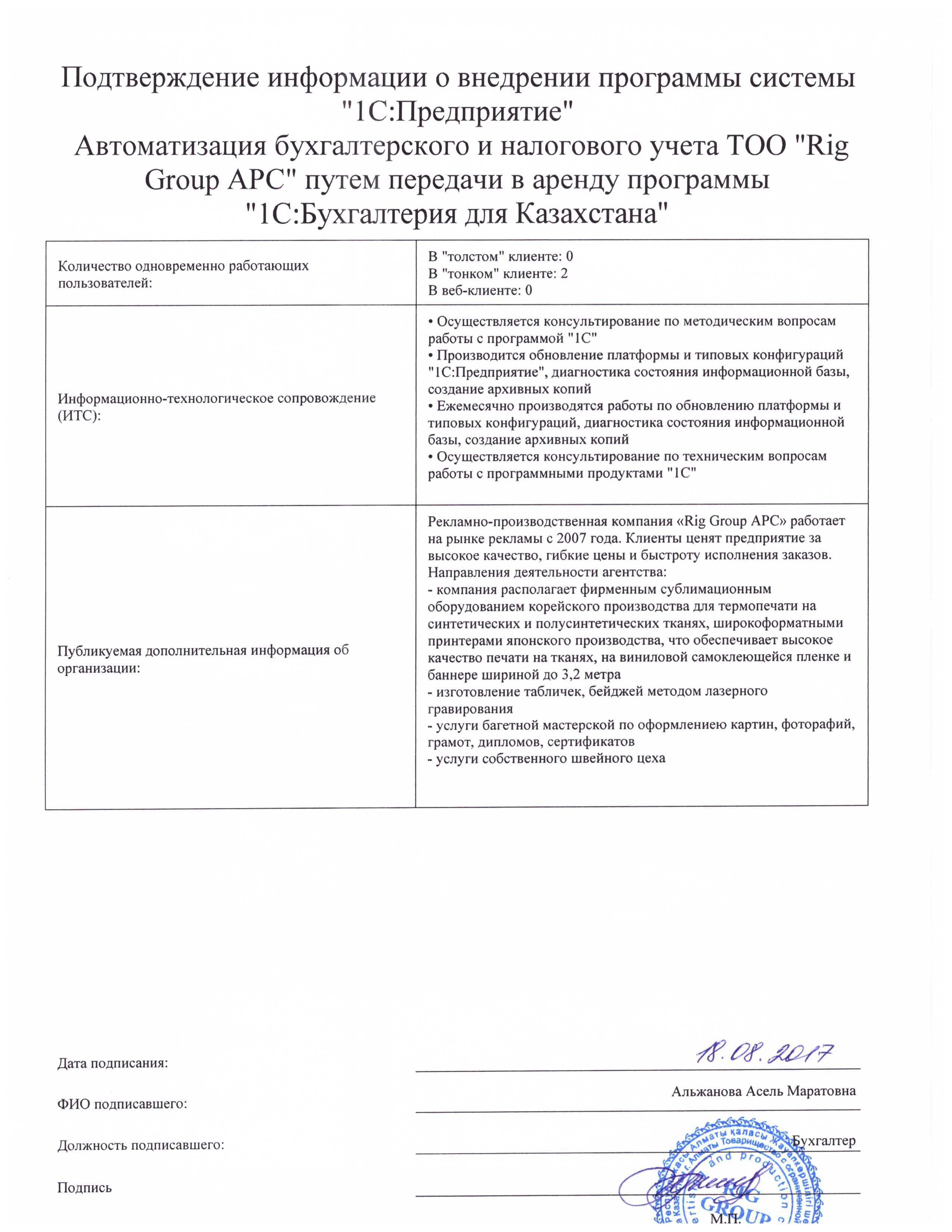 ТОО «Rig Group APC» работает на рынке рекламы с 2007 года. Клиенты ценят предприятие за высокое качество, гибкие цены и быстроту исполнения заказов.