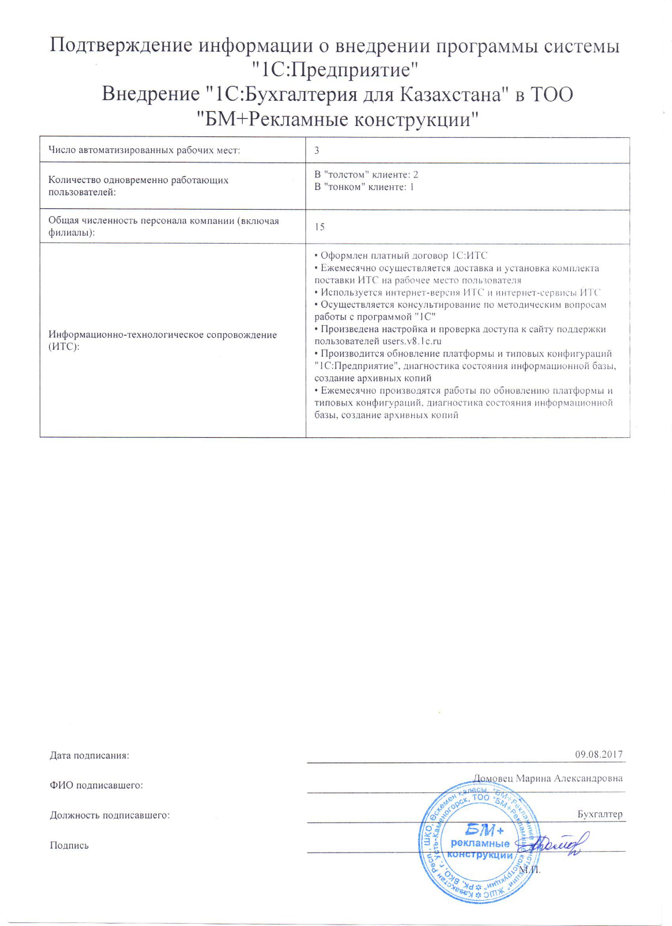 Внедрение «1С:Бухгалтерия 8 для Казахстана» в ТОО «БМ+Рекламные конструкции»