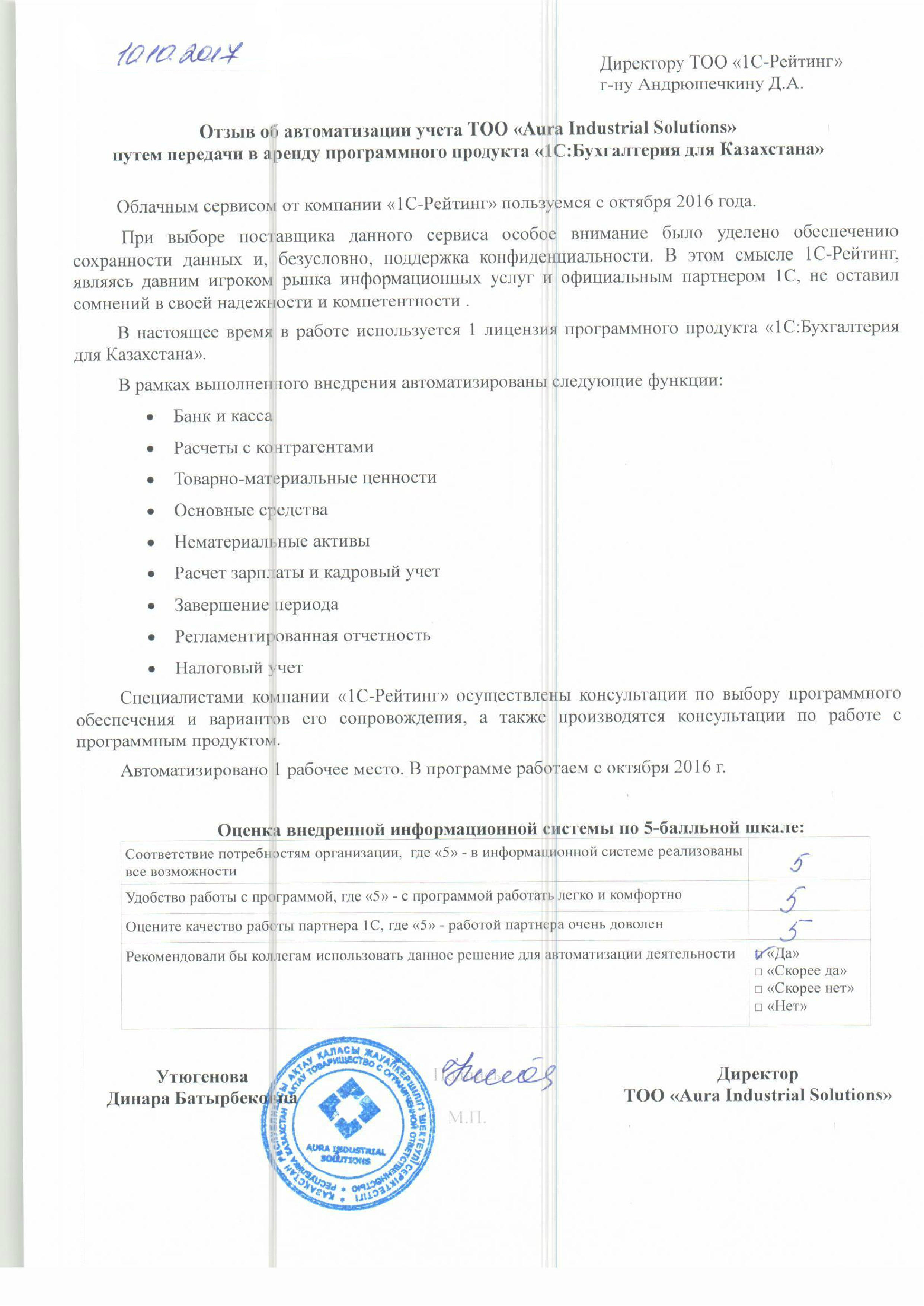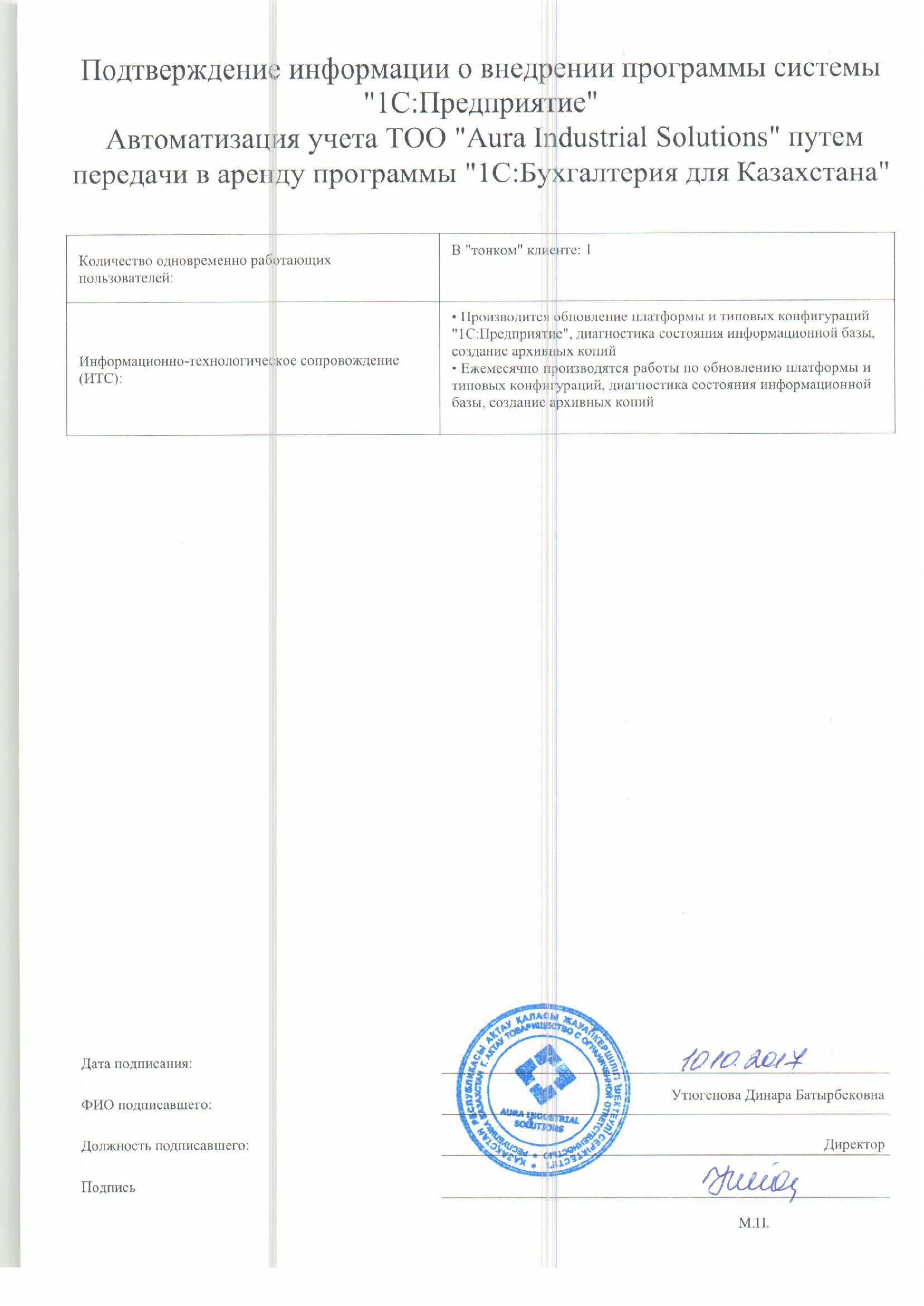 | Арендованное типовое решение: | 1С:Бухгалтерия для Казахстана |